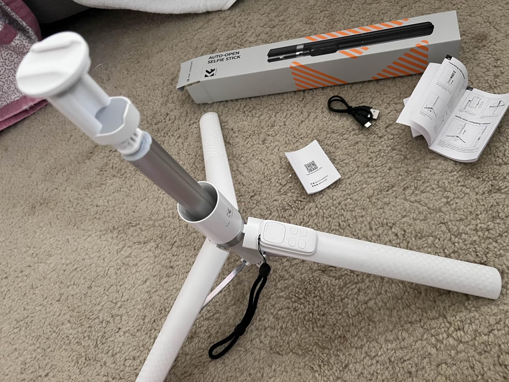 I feel like this is more of a miniature tripod than a selfie stick. It can hold your camera vertically or horizontally, and it comes with a rechargeable remote. I'm really enjoying this portable gadget, now that I know how to use it!It's well-made, versatile, and reasonably priced, but the description doesn't make it very clear what to expect. The instructions help, but it took awhile for me to work through them. Here are a few tips for getting started:*To open with one hand, hold the stick upright near the top and bang it on the ground or floor. I found it easier to just brace it from the top and push upwards with my palm.*Once the legs are spread, you can extend the selfie stick by pulling the metal rod straight out. If you don't need the tripod, just press the legs closed at this point.*When using the tripod, the camera angle can be changed by twisting the phone holder before adjusting the hinge. The hinge adjustment allows for either vertical or horizontal recording.*To easily close the tripod, grasp the white cylinder that surrounds the metal rod, and pull upwards. Then push the rod back in place.