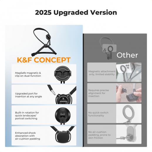 K&F CONCEPT Neck Phone Holder, 2-in-1 Magnetic & Clip-on Phone Neck Holder, POV Phone Holder, Hand Free Chest Stand Compatible with iPhone 17-12 Seires Android Phones