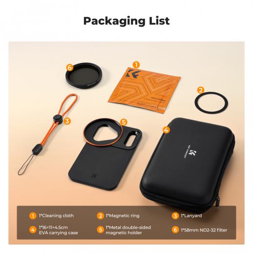 - * 【VND Filter for iPhone】K&F CONCEPT iPhone 17 Pro Max nd filter made of AGC glass with 18 layers of optical coating, the variable neutral density filter for iphone provides 1-5 stops of light reduction, suitable for moderate lighting conditions. You can use it from partly cloudy to sunny days. Meanwhile, the filter ring is compatible with all 58mm threaded filters and supports stacking multiple filters.