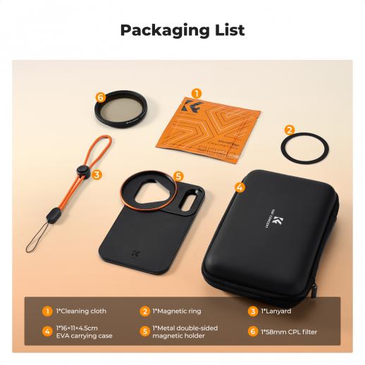 - * 【Standard CPL Filter】K&F CONCEPT iPhone 17 Pro Max CPL filter made of AGC glass with 18 layers of optical coating, it can effectively reduce reflections on non-metallic surfaces and restore true colors. As a CPL filter for iphone,it is especially suitable for shooting blue sky and white clouds, enhancing the shooting texture. Meanwhile, the filter ring is compatible with all 58mm threaded filters and supports stacking multiple filters.