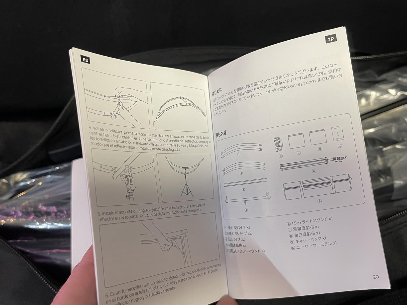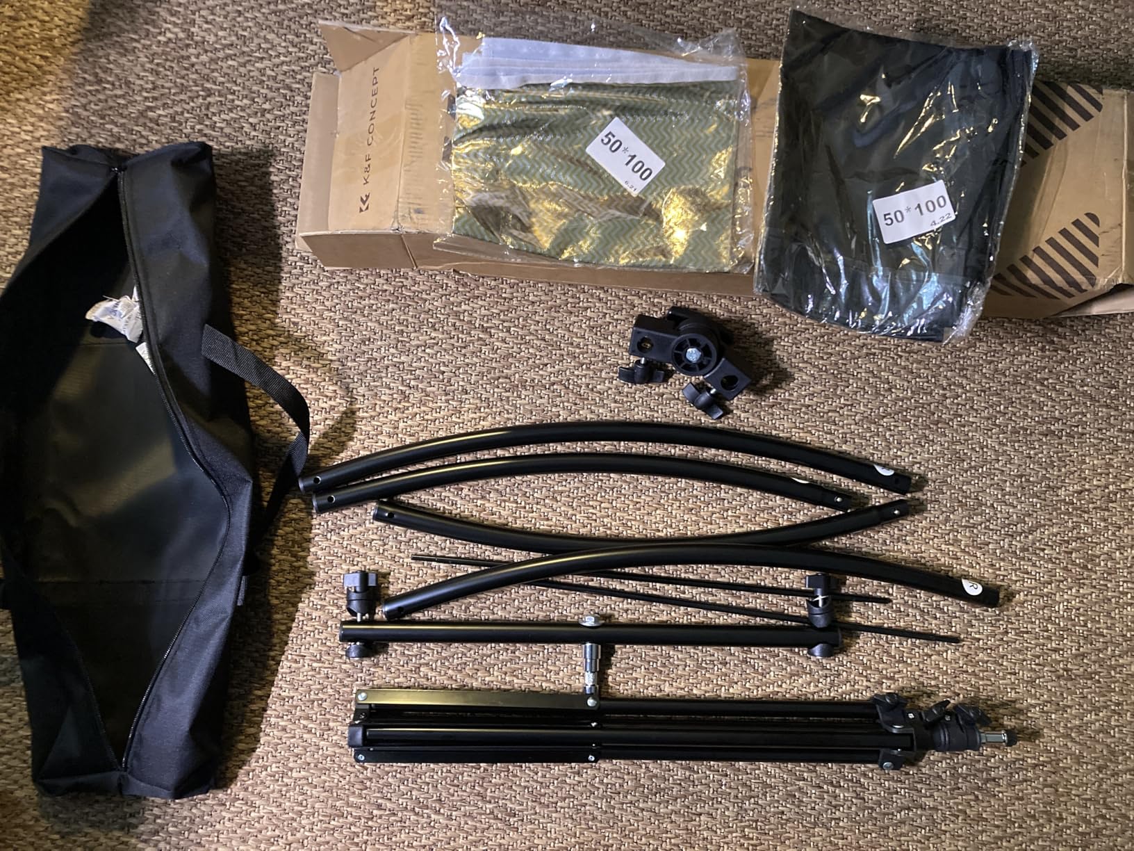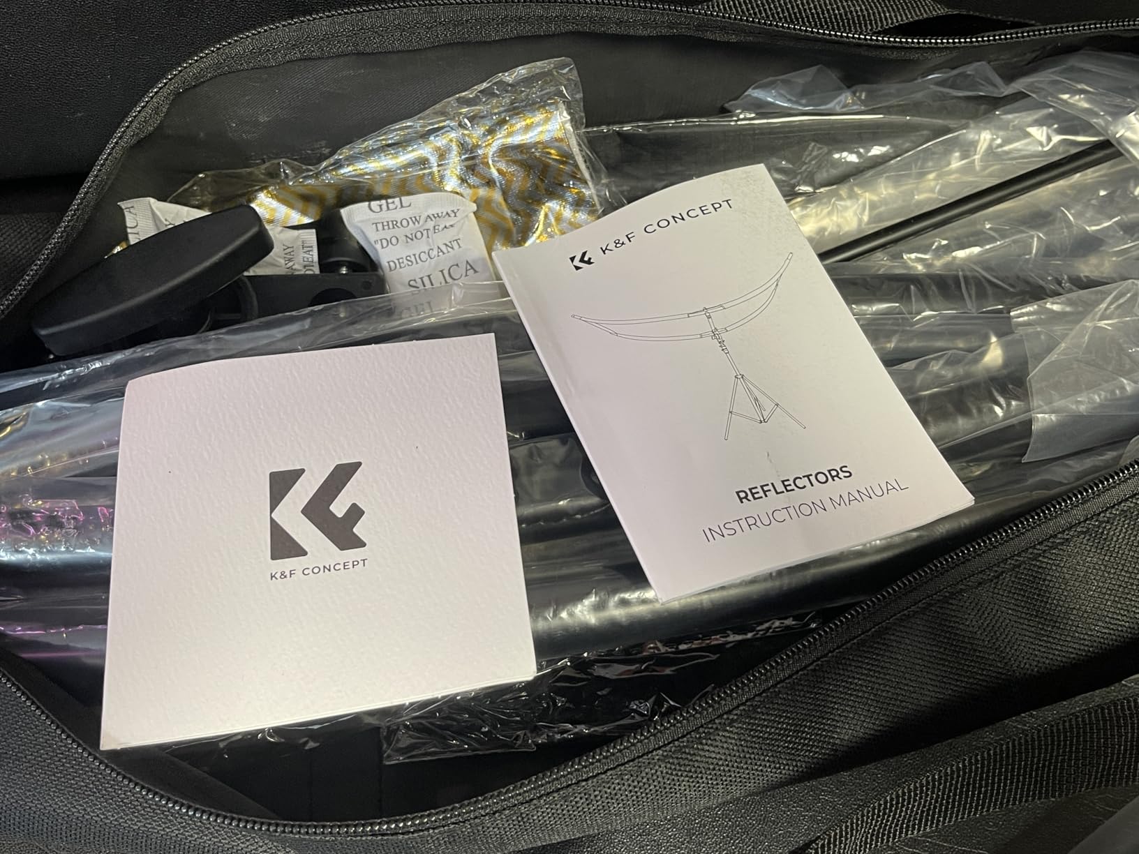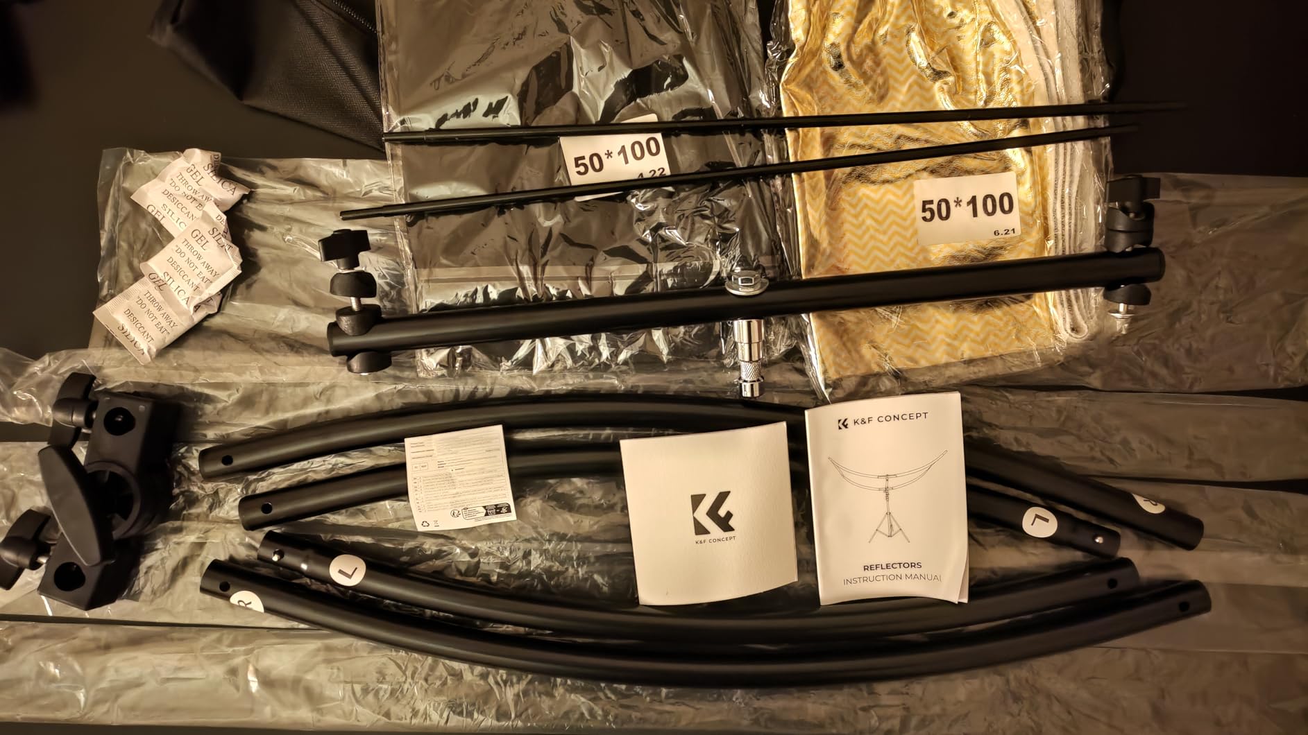 - * 【FULL ACCESSORIES】our set includes 6x bends, 2x metal rods, 1x center connecting rod, 1x swivel bracket, 1x black and silver double sided fabric, 1x gold and white double sided fabric, 1x carrying bag, 1x light stand (1.9m), 1x instruction manual. The set contains a 1.9m light stand, so you can use it as soon as it arrives and don't have to worry about the lack of light stand.