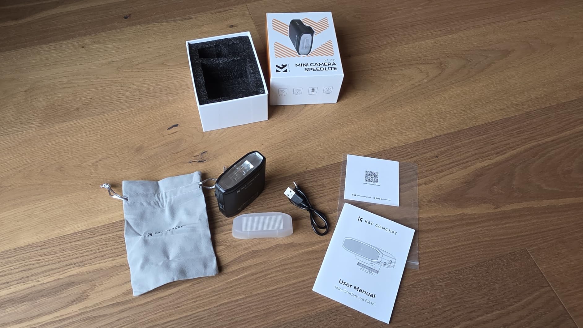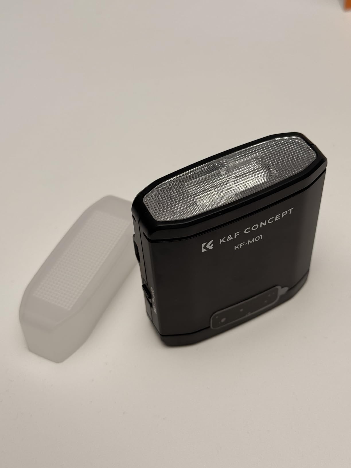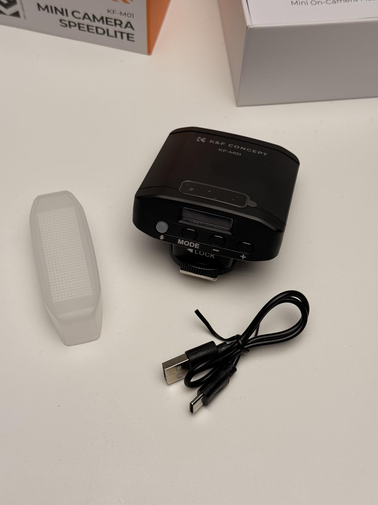 A really well-made, compact, mini flash with a great range of brightness adjustment.In the package, you'll receive the KF-M01 mini flash, a diffuser, USB-C charging cable, and a carrying pouch.(Video shows a quick unboxing and a demo on adjusting the brightness of the flash)