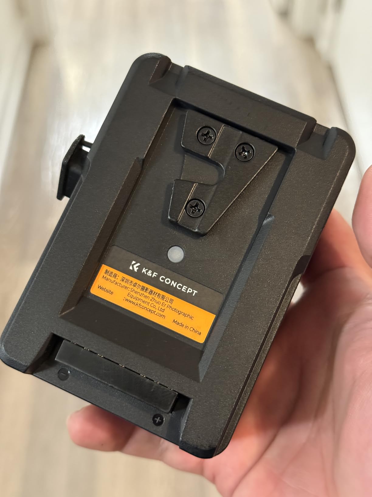 I've been using this battery from K&F for a couple months and I've been really happy with the experience. The battery has really solid construction as well as a bright and reasonably large display. On the back you have the classic V-mount with charging pins that are typical for V-mounts. Truth be told, I think I charged it with these once and used USB-C the rest of the time. There is also a very small light, more on this later.