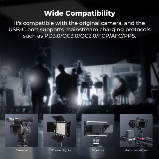 - * 【Battery Capacity】With a high standard capacity of 10500mAh, 7.4V, 77.77Wh, effortlessly meets the demands of extended, high-intensity operation for camcorder, cameras, photography lights and similar equipment, providing a reliable power supply for outdoor photography and filming.