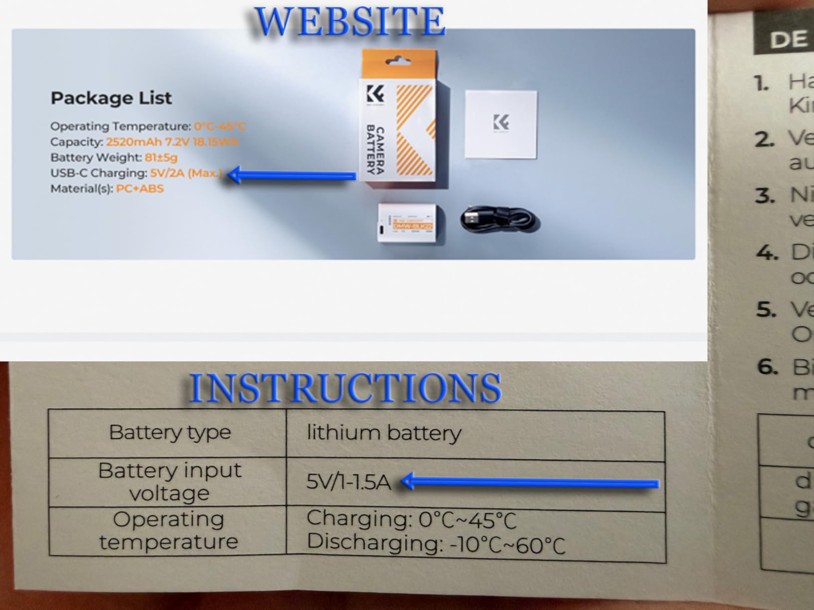 • The printed instructions that come with the battery list the input as 5V/1–1.5A.