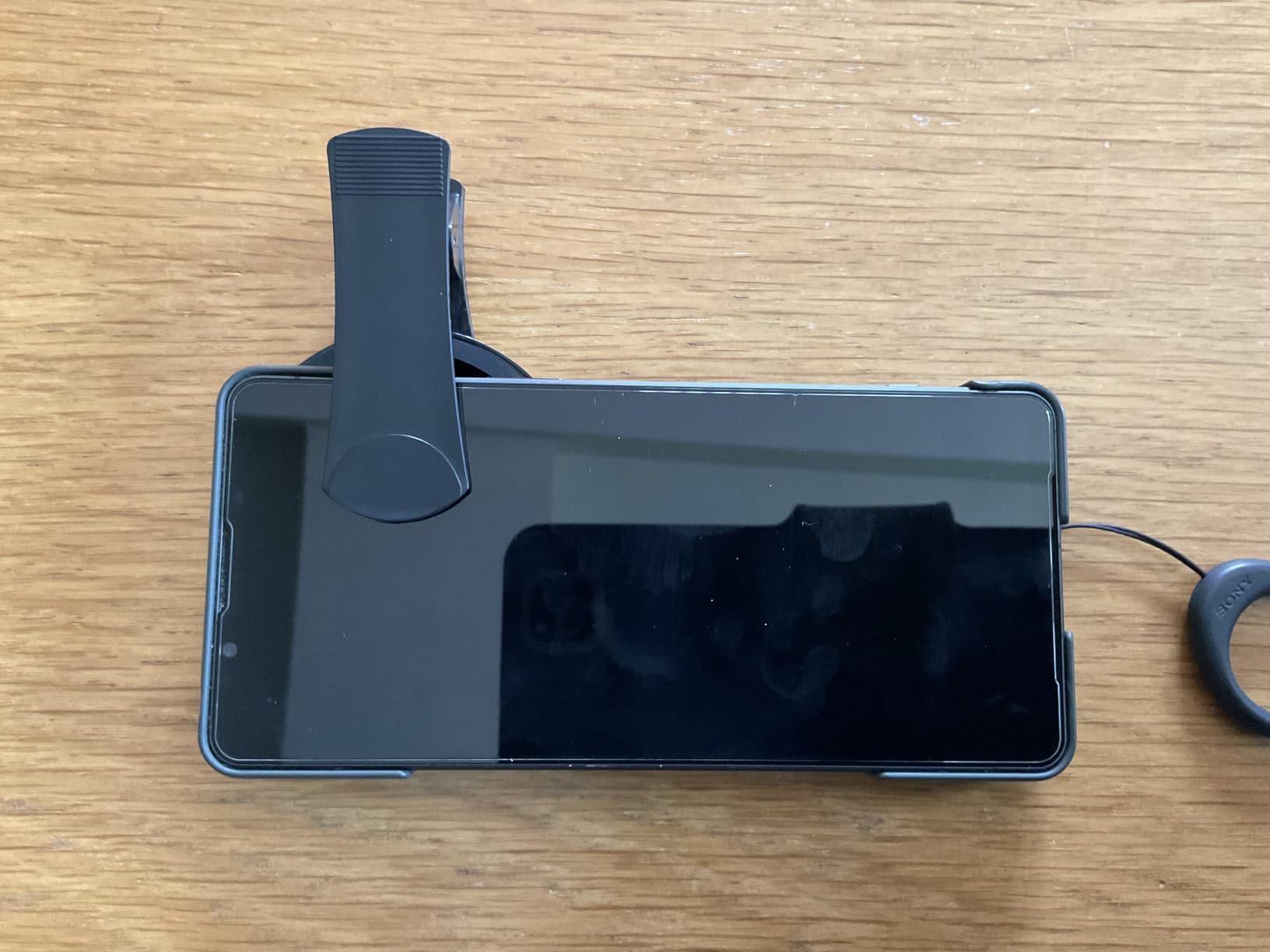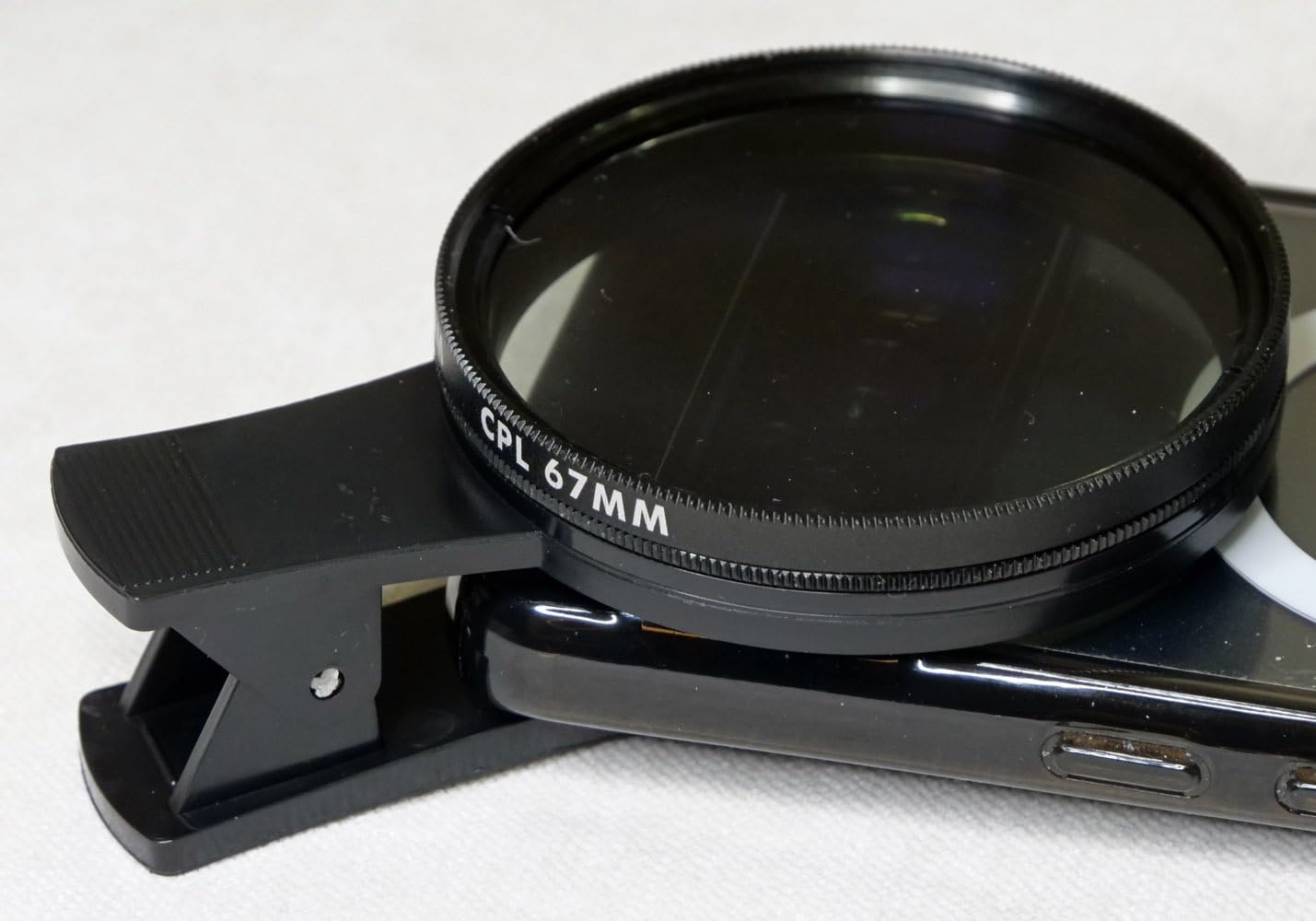 It's a good clip for 67mm filters (all brands are valid). It is made of plastic and the clip rests on the front of the mobile phone, holding the adapter tightly with the filter without putting too much pressure on the touch screen.