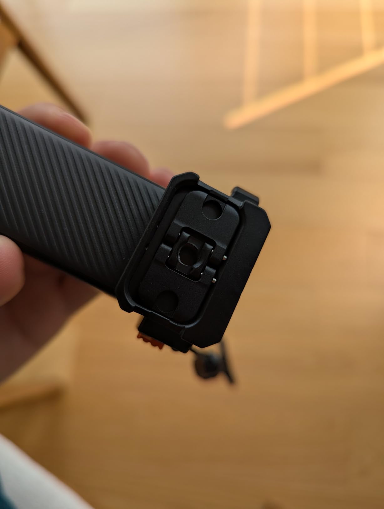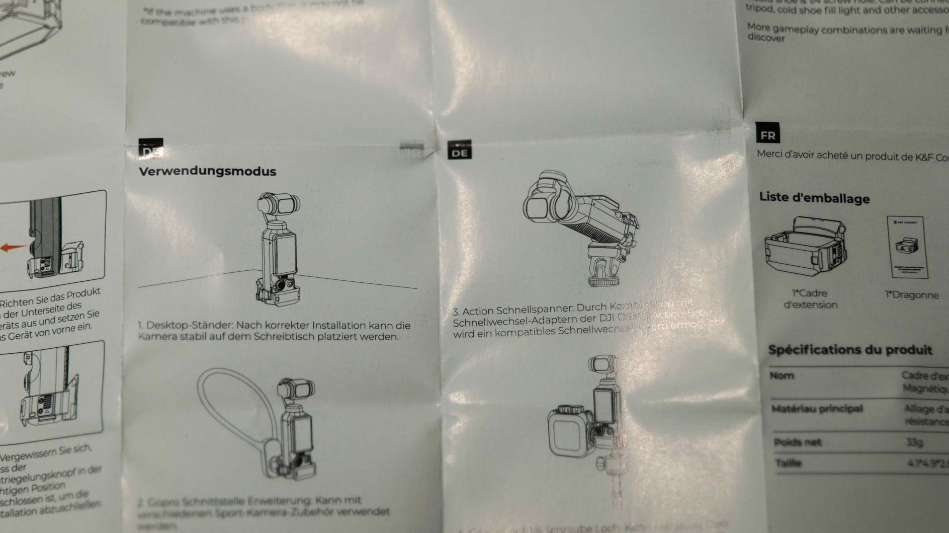 The K&F Concept extension adapter for DJI Osmo Pocket 3 comes with instructions in German and a wrist strap. The adapter is made entirely of metal and is very well and robustly manufactured. With a small, orange lock, you can open the adapter to attach it to Pocket 3. Once installed, the camera is very easy to operate and the memory card is accessible. The Coldshoe and Arca mount and the ¼ inch thread are handy for accessories. And the fold-out mounts for holders are also very practical. The camera also sits well on the inside, as there are small rubber surfaces on the adapter. Overall, a good and still attractively priced accessory, which is a useful addition for Osmo Pocket 3 users who film more often.