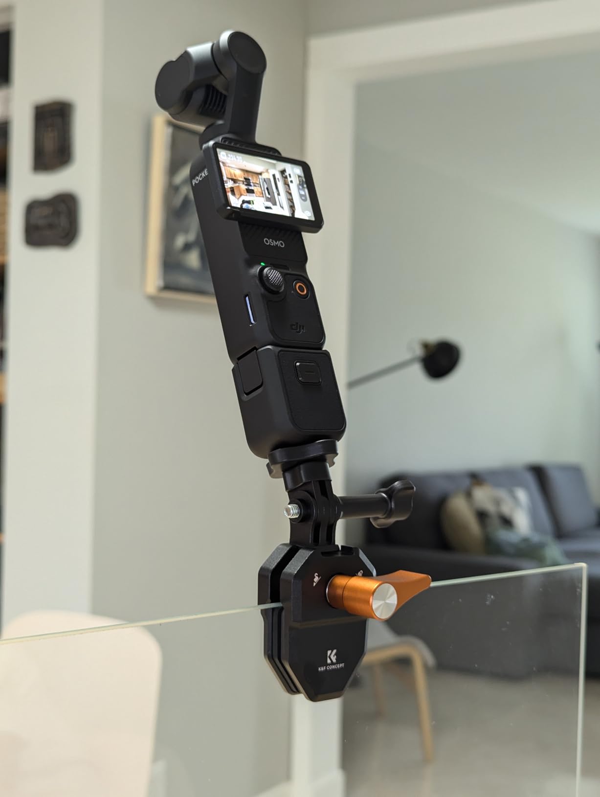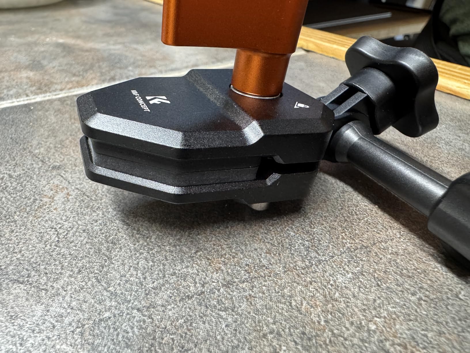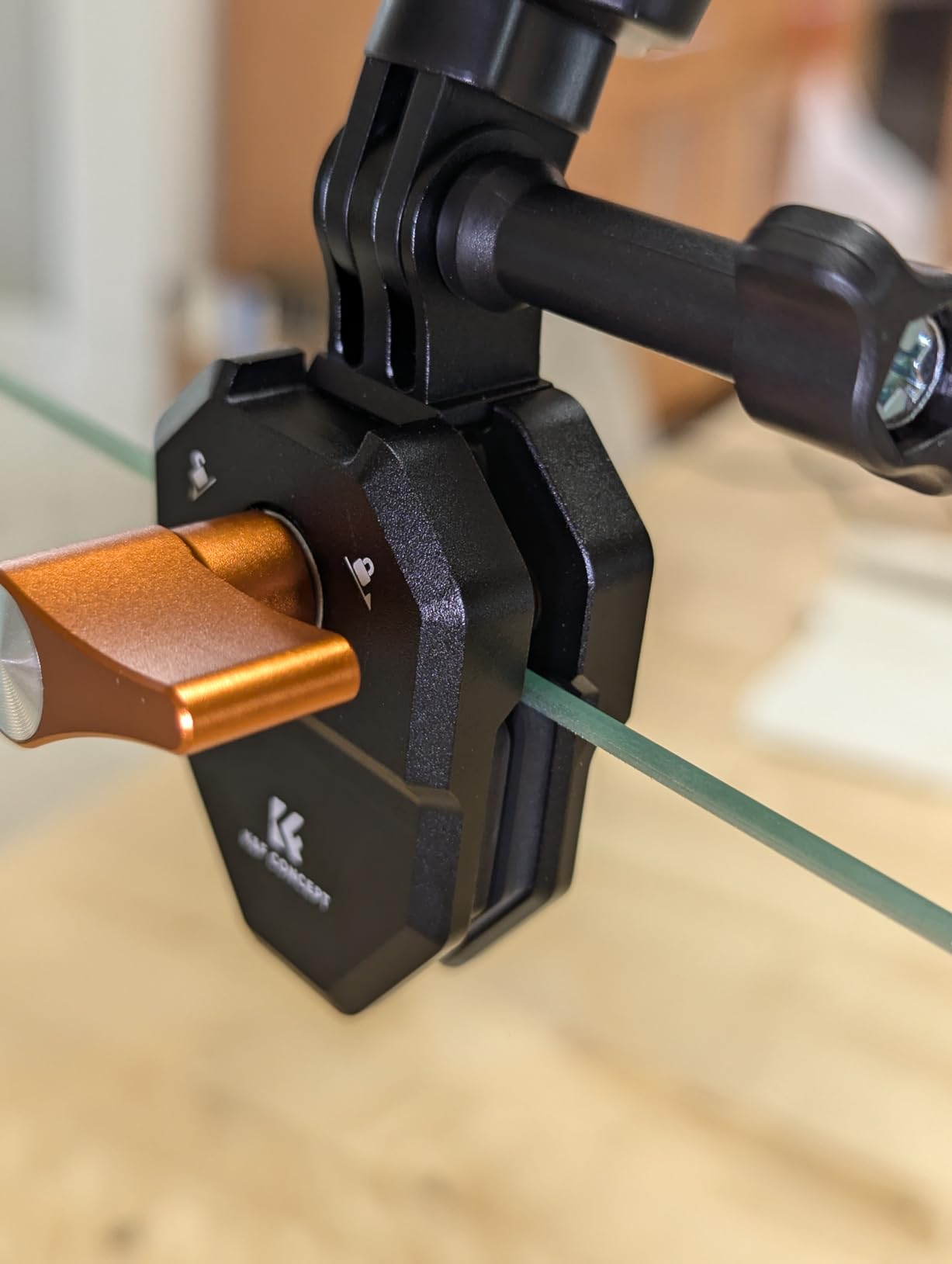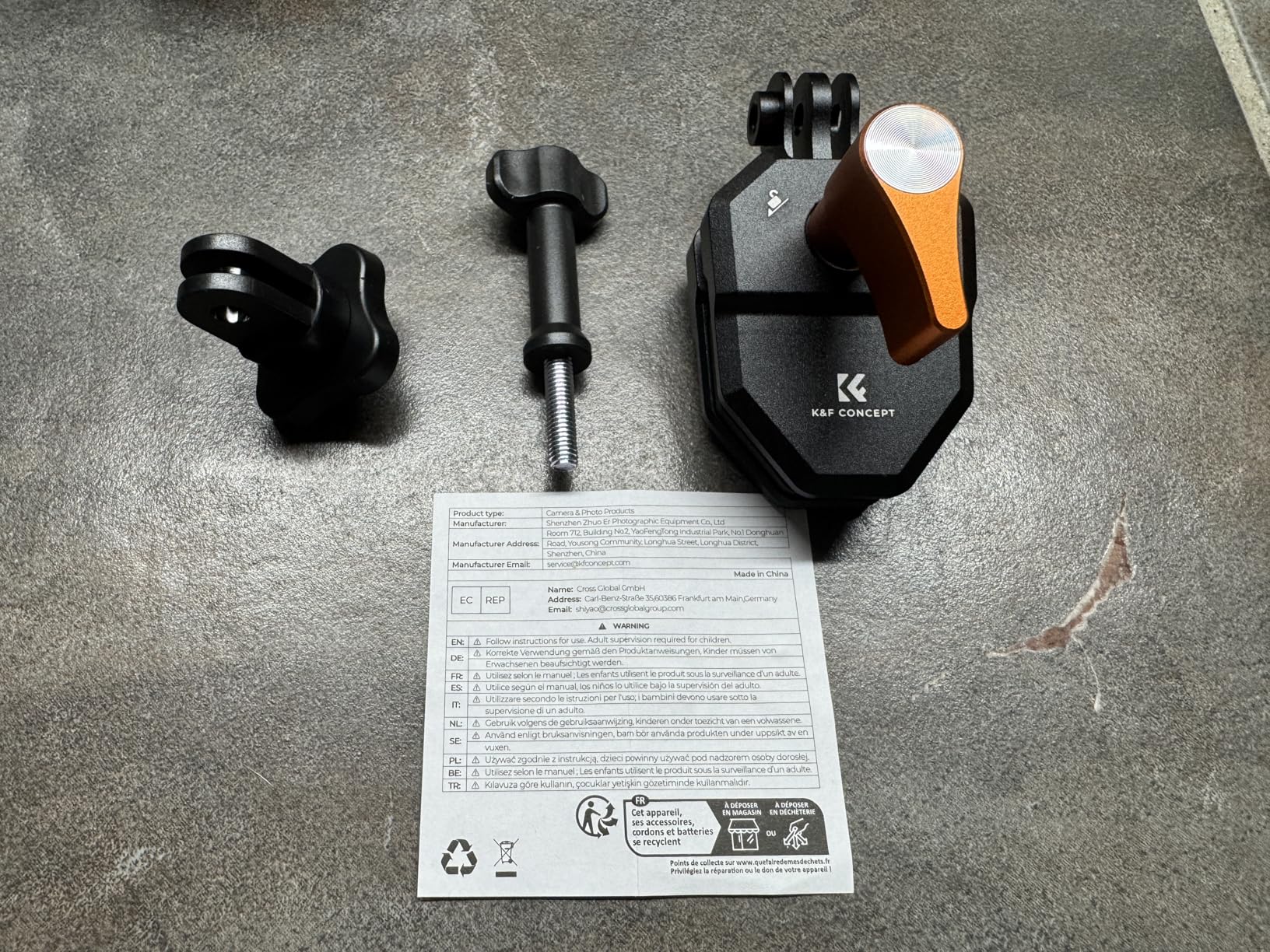 This mount is incredibly well built. The entire thing is made of metal except for the plastic screw mount adapter and tightening knob, which is fine since those don't need to be metal. Everything operates very smoothly when opening and closing, and the whole contraption feels extremely solid.While I'm not the target demographic since I don't own a motorcycle, I do have a foldable kayak with edges that are about the right width for this clamp. My plan is to mount it on the front edge of the kayak so I can attach either my Osmo Action 3 or other action cameras for paddling videos, and I'm convinced this will do a superb job for that purpose.I did some testing clamping it to a piece of glass to check the grip strength, and it holds rock solid. The clamp has two guide bars that prevent any wiggling or vibration, plus two rubber or silicone pads that cushion the clamping force. There's no danger of cracking or scratching whatever you're clamping to, even if you overtighten it a bit.The orange handle keeps with K&F Concept's signature black and orange color scheme, so it matches nicely with other accessories from the brand. The 180-degree angle adjustment works smoothly and locks in place securely.One possible improvement for future versions would be to include an optional extension arm for situations where you might need to raise the camera higher or position it further away from the mounting surface. Just a small 2-3 inch extender would give users more flexibility.Overall, this is exactly what you'd expect from K&F Concept - excellent build quality and thoughtful design. Even if you don't have a motorcycle, this could work great for boats, kayaks, or any situation where you need a solid clamp mount.Definitely five stars and very good value for the money.
