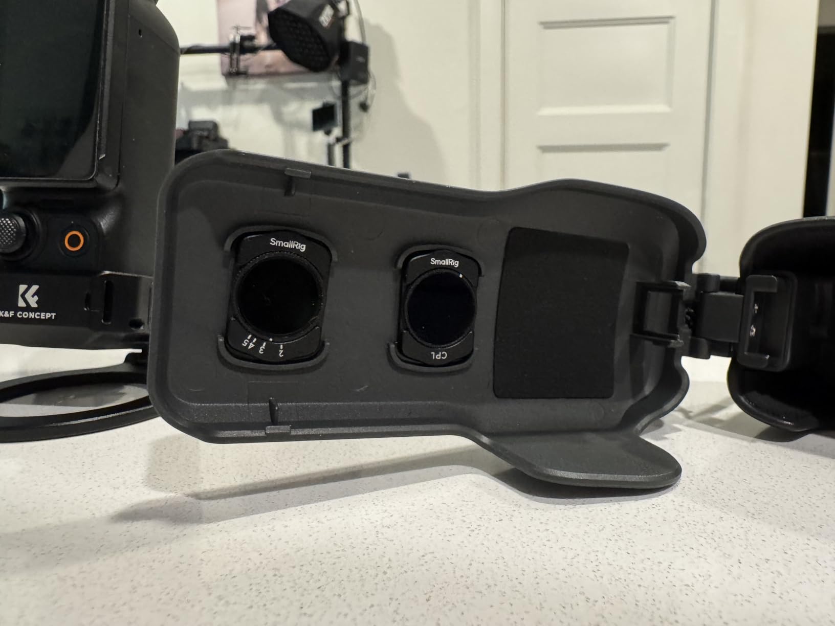 The lid has two openings for storing magnetic filters, which is a plus point. Mind you, it doesn't work for the original wide-angle lens, but it does work for nd or black mist filters that are finer. Once placed, when closed, it protects all the delicate areas that are normally left in the air. The body part itself is quite sturdy and won't have any problems, but the gimbal is much safer with this cover on.
