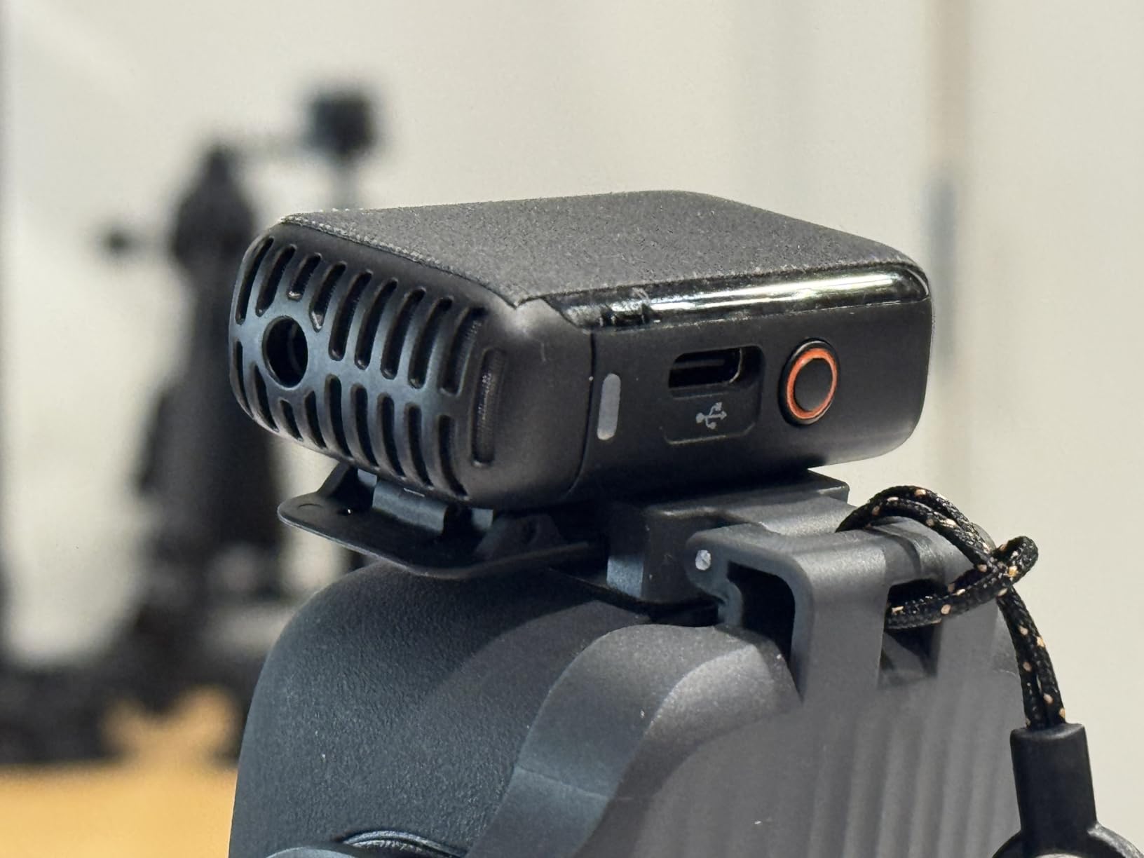 It also has a rope that, honestly, I don't see much sense to it other than being able to splice another rope or something similar. The interesting thing is that upstairs there is a hole where you can place the DJI Mic 2 that comes with the Creator Combo. Of course, important: in order to fit it properly, you have to remove the magnet from the microphone, otherwise it doesn't fit properly.