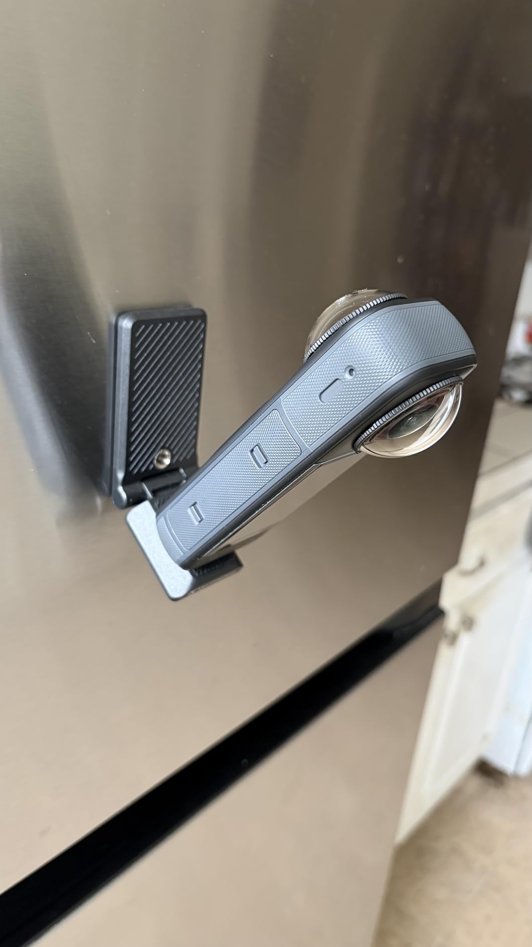 This is a great versatile mount. It has strong magnets and solid hinges. I mostly got this to use with my Ricoh Theta S. But It could easily be used to mount my Wyze Cam, Euphy Cam or with an adaptor, my phone. It has a standard 1/4” screw that has a nice big head on it and a flap so if you don’t have a screwdriver handy, you can finger tighten it easily. There are two metal plates included with 3M adhesive on one side. These can be attached to nonmetallic surfaces where you may want to mount your phone so the magnetic side of the stand can quickly be fastened to the surface. No screw holes necessary. Lots of possibilities for mounting this stand indoor, outdoor, vehicle, wall, desk, shelf fridge. The quality will keep your shots stable and your equipment safe.