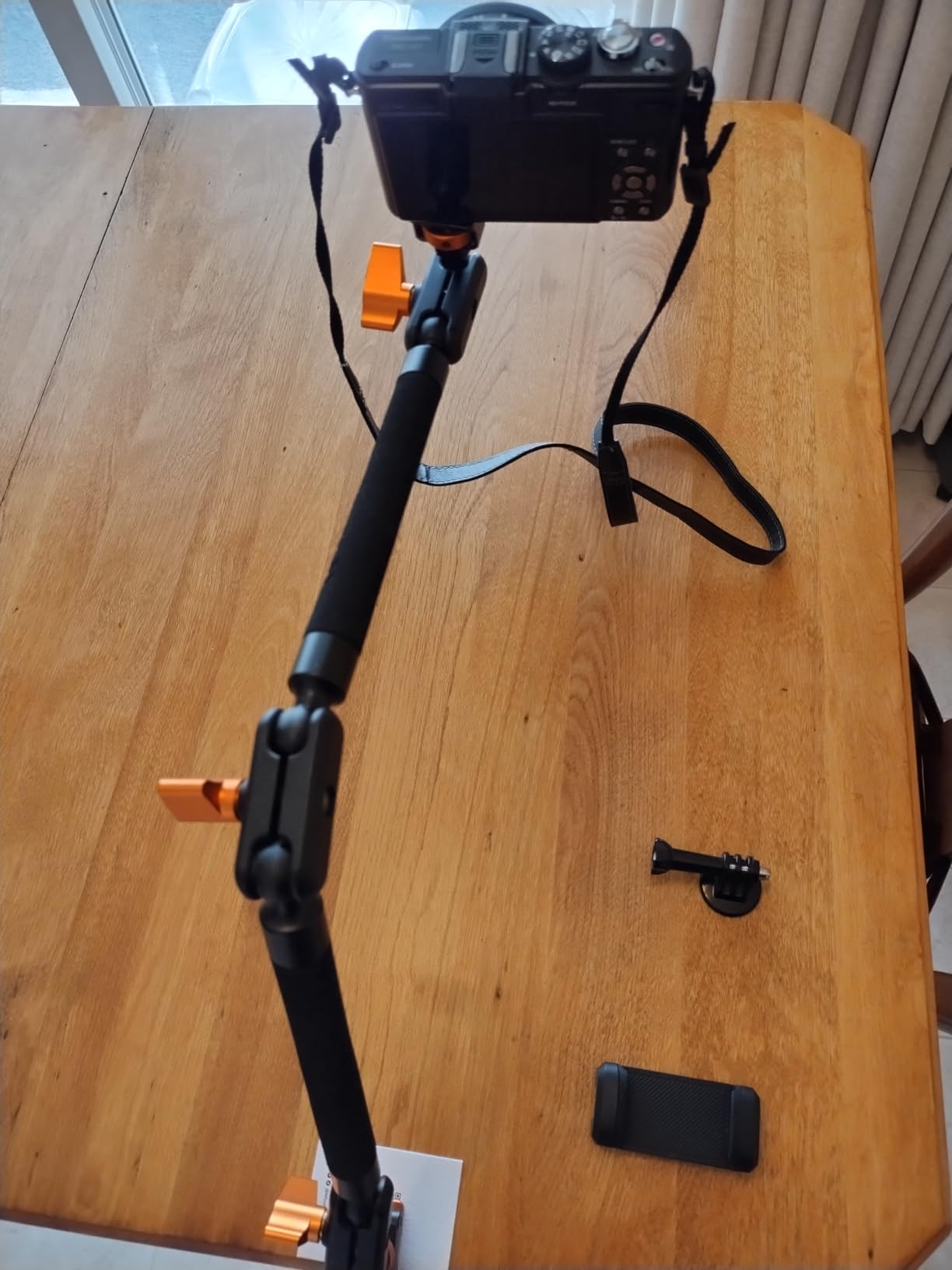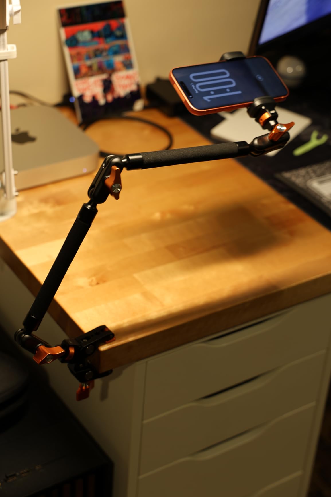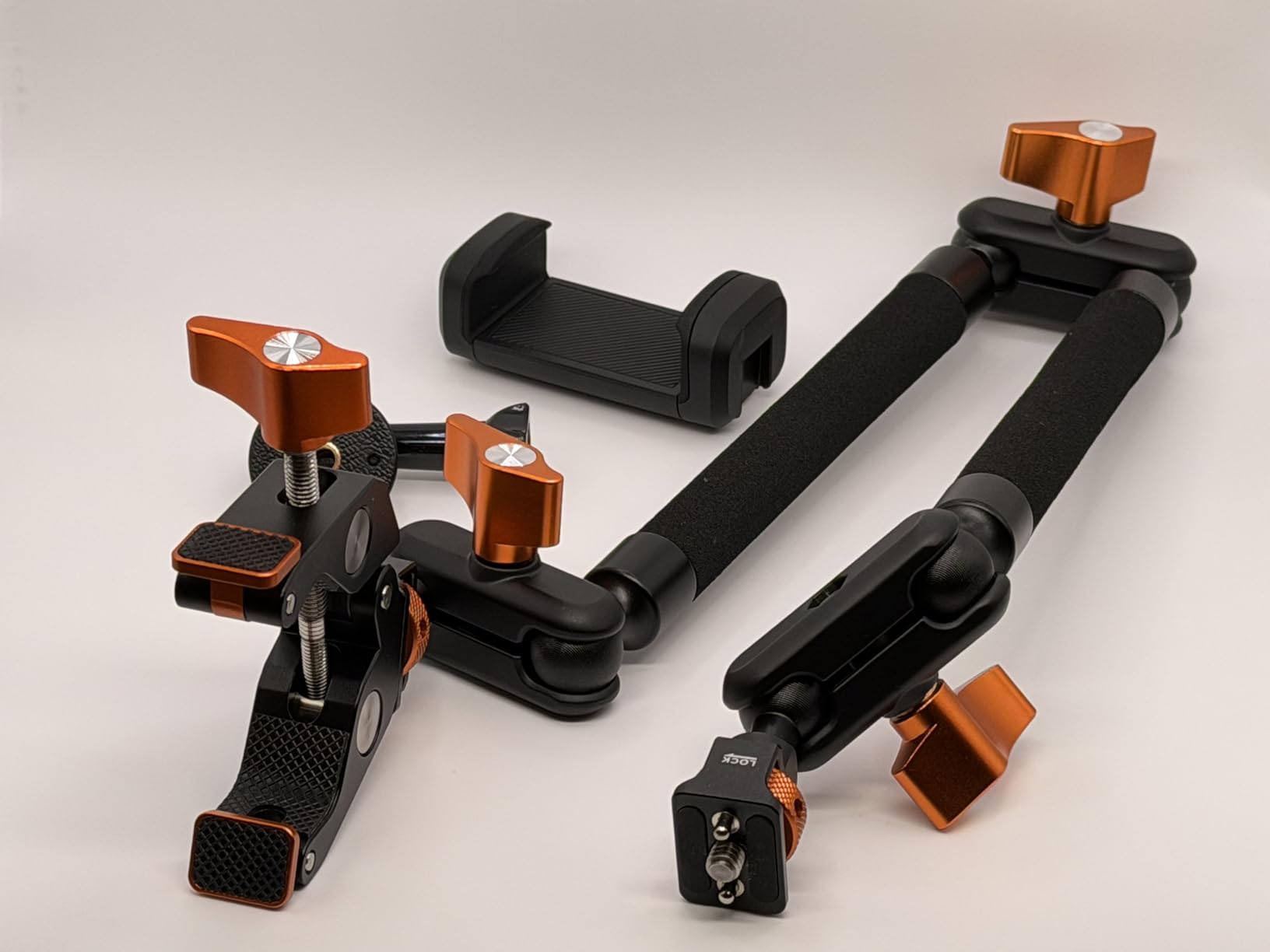 Got this for my granddaughter who is into photography and graphic design, and she was very pleased to be gifted with it. This arm kit is very adjustable and allows placements and angles of cameras or phones to be just where a photographer would want them. Hardware and materials used in the product are very high quality, and the design is thoughtful, lightweight, compact when folded, and very transportable.However, the arm isn't rock-steady, with some detectable flex coming from the first joint right off the clamping mechanism. That's disappointing and would require using a timer or remote shutter release to eliminate movement at the moment of taking a photo. If a remote release or timer is a viable option, then this kit would be a good choice. Otherwise, there may be studier options to choose from.