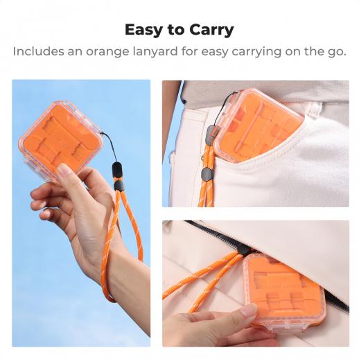 Transparent Double-Sided Memory Card Case with Customizable Slots, Waterproof & Shockproof Storage Holder for 2 CF-A, 2 SD, 8 Micro SD/TF Cards, Includes Orange Lanyard