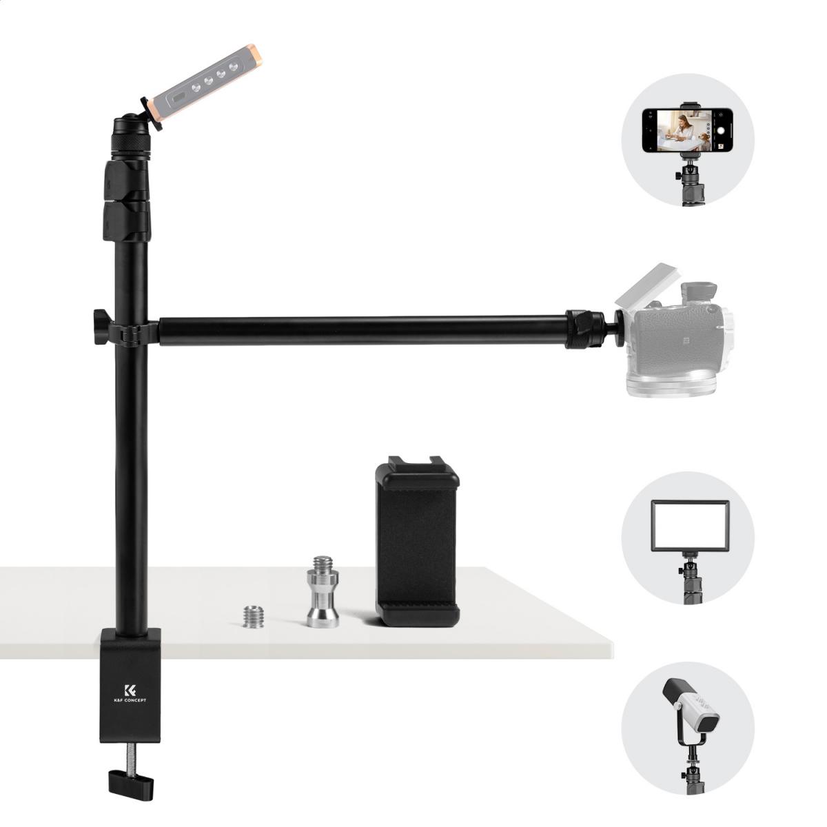K&F CONCEPT Overhead Camera Mount Stand with 2 Section Telescopic Extension Arm, Adjustable Desk Stand with Phone Holder, C-clamp Mount for DSLR Camera, Phone, Webcam, Microphone, Ring Light