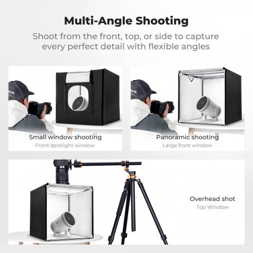 - * 【Multi angle Lighting and Shooting】This photo shooting tent includes two fully rotatable light panels that can be positioned freely for top, front, or side lighting. Combined with the front and top shooting openings and silver reflective interior lining, this setup allows 360-degree shooting flexibility, uniform illumination, and sharp detail—perfect for capturing textures, jewelry, electronics, and reflective surfaces.