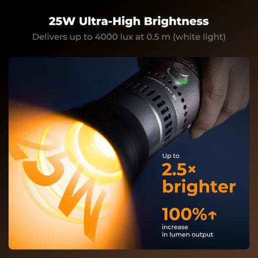 - * [25W High Output & 4000 Lux Power Beam] Professional 25W RGB spotlight delivers up to 4000 lux at 0.5m, 2.5× brighter than standard mini photo lights. Built-in cooling fan ensures stable full-power output without overheating. Ideal for photography lighting, video recording, product shoots, studio setups and content creation.