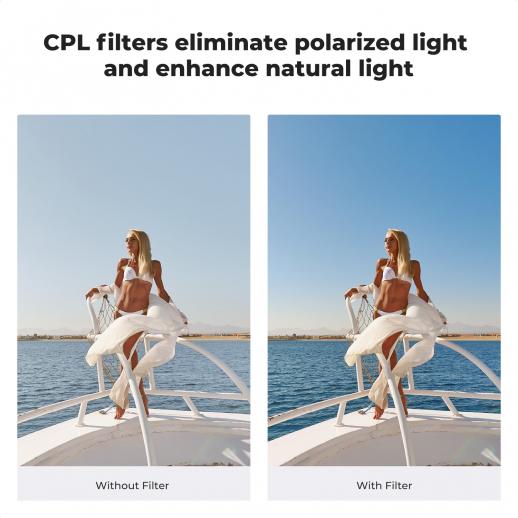 - * [Vivid Colors & Reduced Glare]: The Circular Polarizer (CPL) cuts through distracting reflections from water, glass, and other surfaces. Enhance color saturation and contrast for deeper blues and greener foliage, making your videos pop