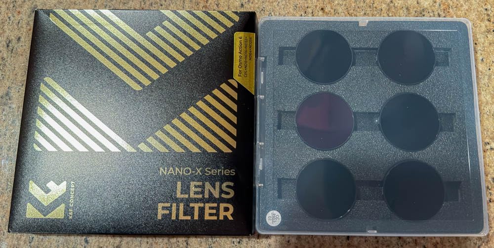 This K&F Concept snap on filter kit is compatible with the DJI Osmo Action 6 and includes CPL, ND8, ND16, ND32, ND64, plus a black diffusion filter. Installation was quick and easy. The filters fit over the camera like a glove and snap on securely with no looseness or alignment issues. I included a picture of my apartment pool in January taken with the polarizing lens.Once installed, everything sits flush and looks seamless on the camera. The lens filter also adds an extra layer of protection, which is a nice bonus beyond just exposure control. It feels secure enough that I would be comfortable leaving one on during regular use.In practice, the filters perform exactly as expected. Exposure control is predictable, glare reduction works well, and image quality stays clean with no obvious color shifts. The ND range is useful for bright outdoor shooting, and the CPL behaves the way it should.One small nitpick is that the filters are not labeled. That said, they are easy enough to tell apart once you use them, and it did not impact actual use. The included carrying case is very nice, keeps everything organized, and makes storage and transport simple.Overall, this is a solid, well fitting filter set that does what it promises and adds protection at the same time. Easy to use, well packaged, and reliable.