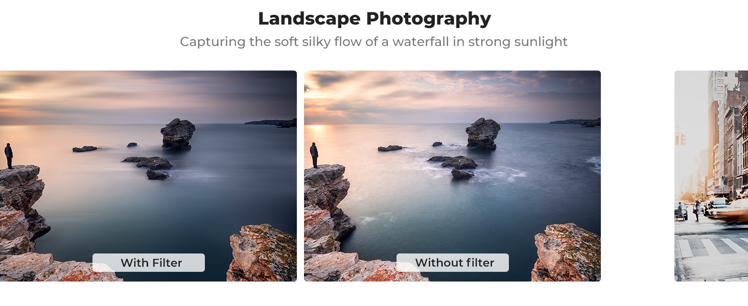 When too much light hits the sensor, your image becomes overexposed. With an ND filter camera setup, you can shoot at slower shutter speeds or wider apertures, even under harsh sunlight, and still maintain perfect exposure.
