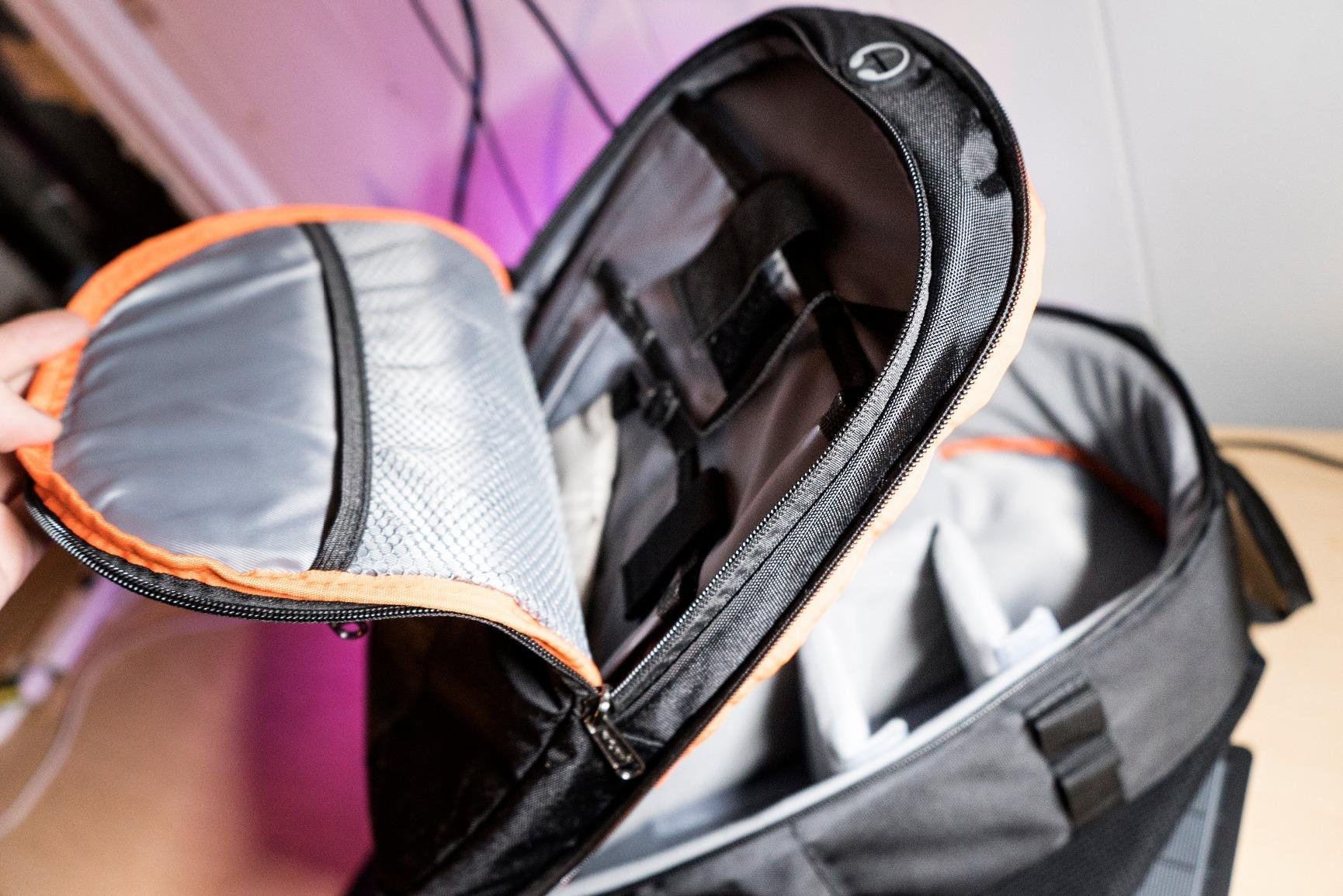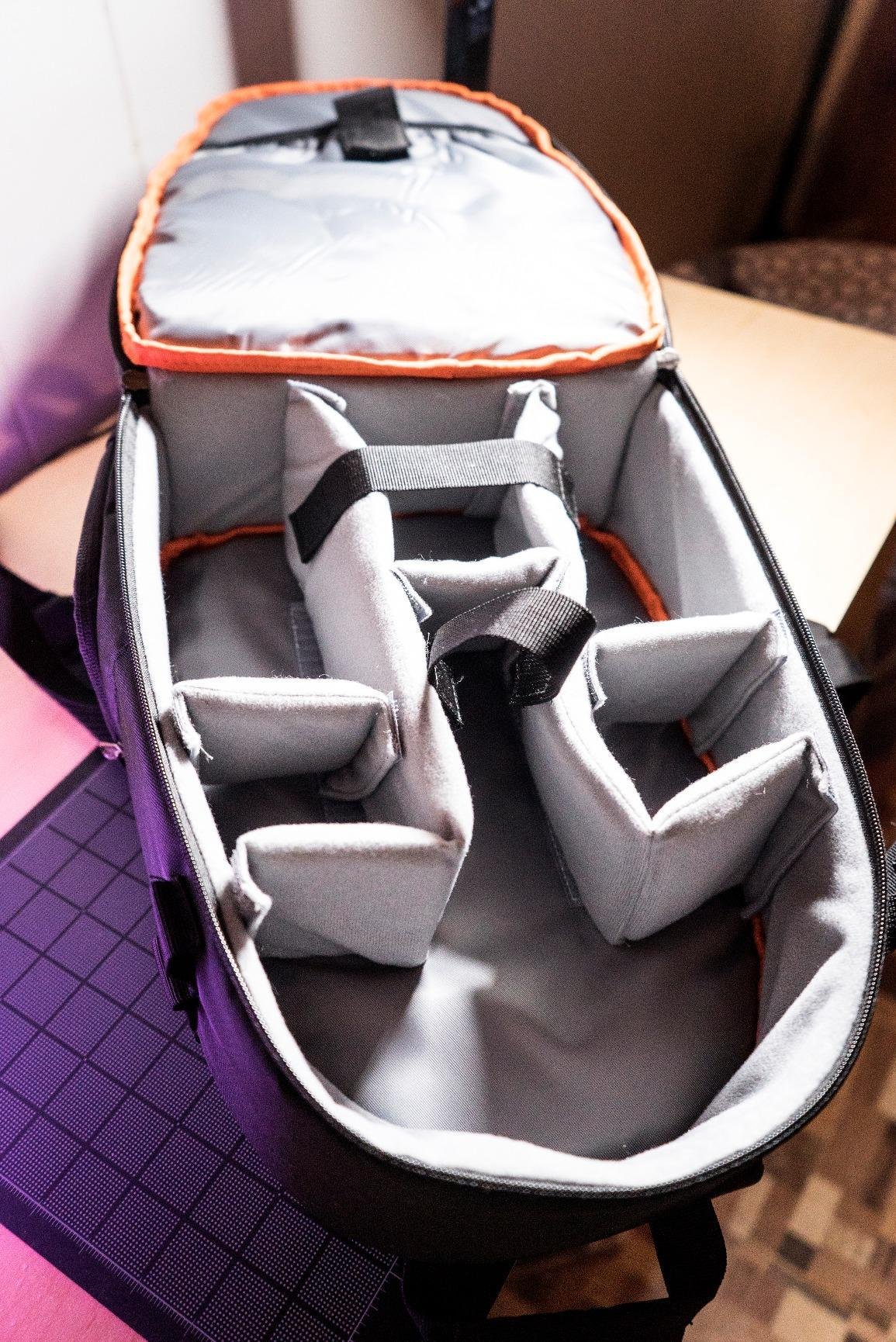 This camera bag comes with TWO full size zipper compartments as well as side zippers and a mini zipper in the front.This bag is enough for a photographer that needs to move around during a gig and requires a couple of lenses on hand as well. In my case, I used this bag during a wedding shoot and I needed to keep the itinerary for the event somewhere on me and it's so convenient that there's a second large zipper compartment for me to slip my folder inside.I keep all my memory cards in a hard cash and stored in the front zipper for easy access. I keep batteries on the side zippers for easy access as well.Overall, it's a very resourceful design and I love the orange contrast they have inside. It lets me see my equipment and locate them faster when i'm running around.I hope this review was helpful!UPDATE (June 3rd, 2016): It's been a couple months since I used this bag and it holds everything I need. I use to use a huge pelican case to hold my camera, lenses, batteries, chargers, cage, handle bar, and ND filters. I now can put everything in this bag with room to spare! It's a lot easier to carry this and it makes "run-n-gun" work a whole lot easier. For those who want to get around easier as a freelancer. This is super handy. I still highly reccomend it.