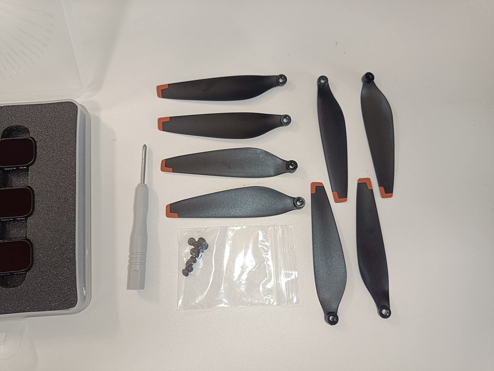 There were also 2 sets of propellers and screws + screwdriver. The only criticism of these compared to the originals is that the orange at the ends is only colored and there are no rubber tips. But that doesn't change the flight behavior of the drone.