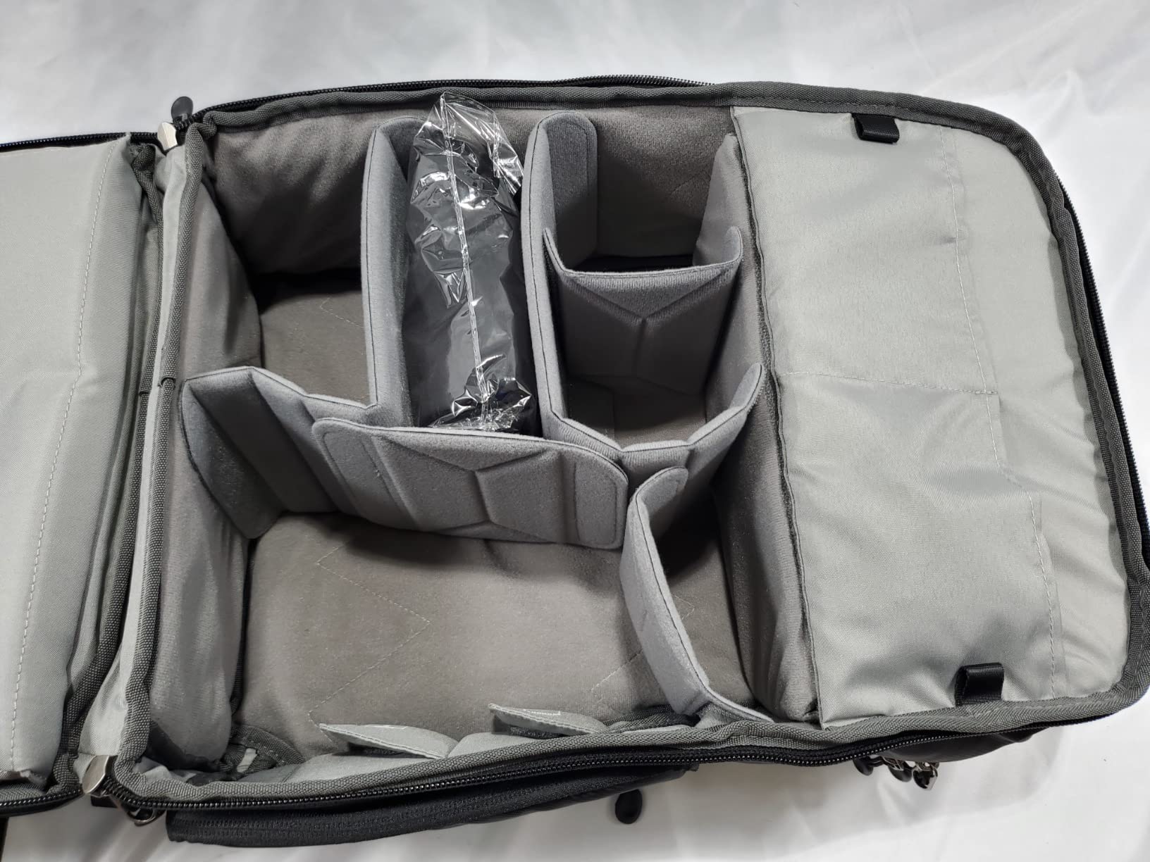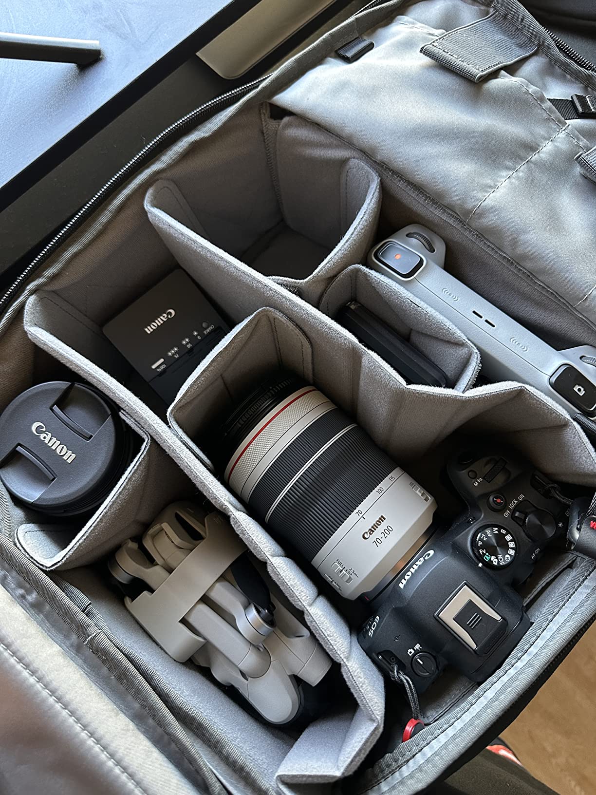So, the images they show to us are absolutely truly, I packed my camera, compter etc exactly like it is in pictures, style of bag also 5 stars, it doesn’t look like camera bag - it looks like fancy travel bag It fits for r5 + 70-200 + 24-70 + dji 3 pro mini with all equipment and you still have lots of space Also has laptop pocket 5 stars, thank you