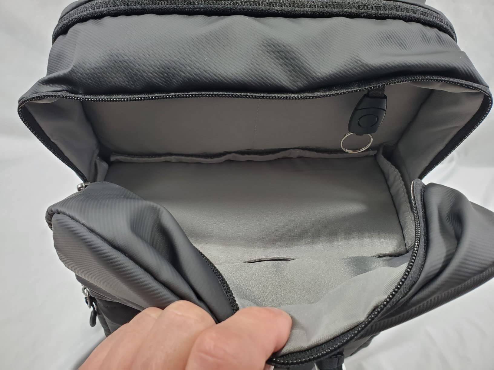 Super light photo backpack, comfortable to carry. Enough space for my @6000 and various lenses. There's plenty of room in the main compartment for pole and four ND filters, as well as adapter rings and charging cables. A full-frame camera would also be possible without limitations. Smart idea with side access options with a pocket for a spare battery and memory card. In the main compartment I place the included rain cover, as well as an L-bracket and a small tripod. Telescopic tripod can be mounted outdoors. Integrated ring for car keys - very practical. Zippers protected from rain by overlapping. Absolutely well thought out backpack.