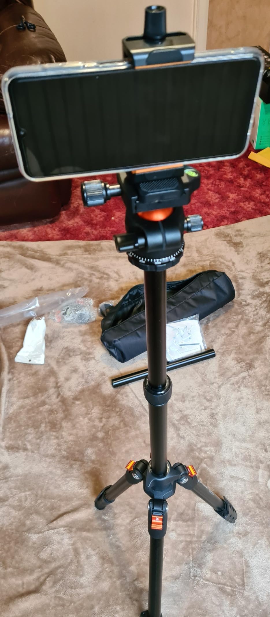 The pluses are that it comes with a carrying bag and with a ball head and a phone holder.