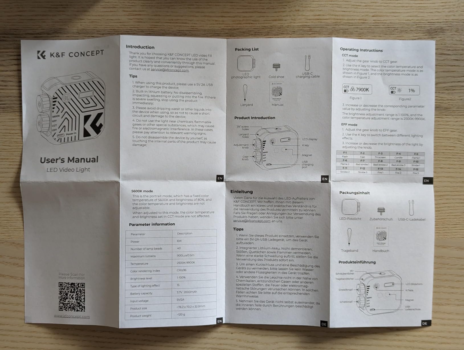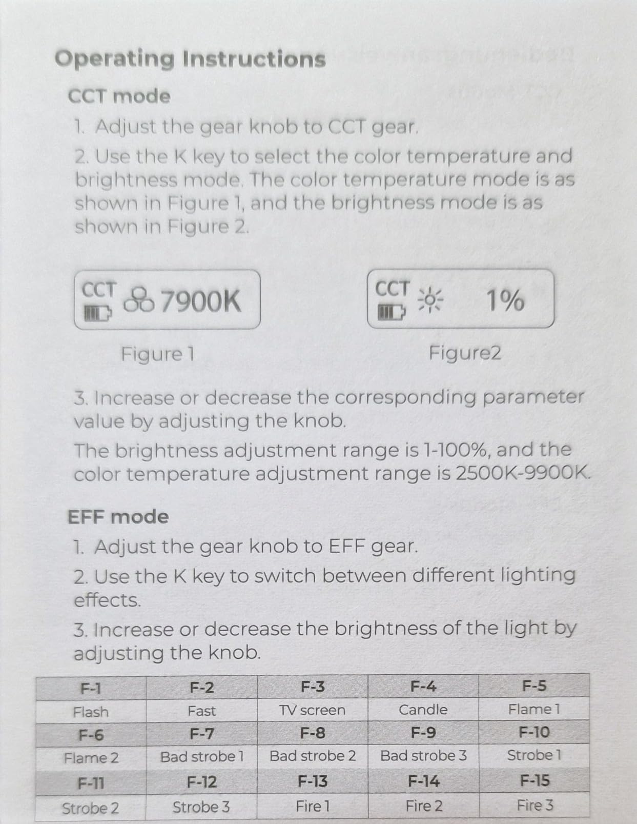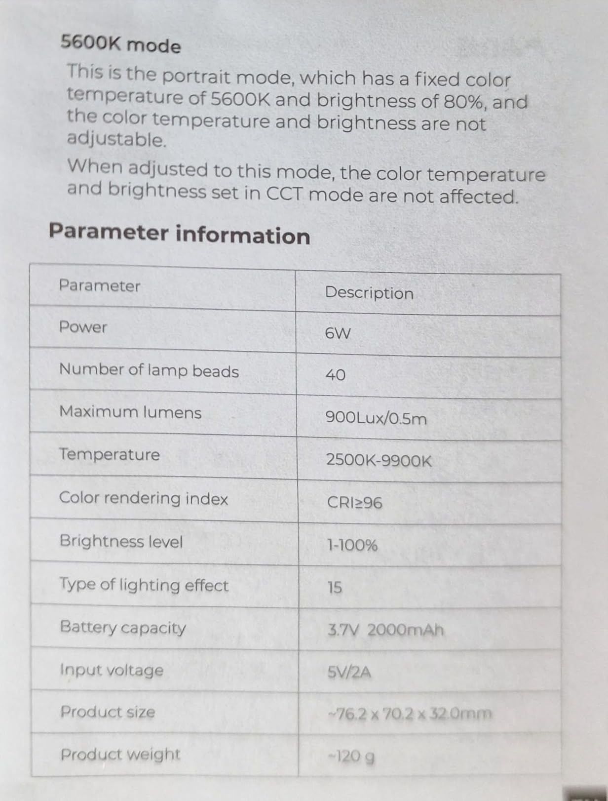 With this light you get an instruction manual, lanyard, cold shoe and charging cable all packed together into a small and very solid cardboard box. I do think that the manufacturers have gone a bit over the top on presentation for a device that holds its own without that. The instruction manual is only a leaflet with instructions in English, German, and Chinese. It is very brief, but given how intuitive the light is, it is enough. The charging cable is USB-A to USB-C and short (about 16cm). The controls are quite straight forward. There is one knob to switch the light on and to select a mode, and another for varying brightnesstemperature etc where applicable. There is an orange button on the side that allows you to switch between effects in Effect (EFF) mode. CCT mode allows you to change the light colour temperature between 2500K and 9900k. EFF gives you a variety of different effect such as strobes, candlelight, fireworks etc. for videoing. 5600k mode (portrait mode) is a fixed colour temperature and brightness. There is a small LCD screen that gives you information about the mode you that you are in. The inclusion of the cold shoe means that you can attach the light to a tripod or similar mount. This is a solid, compact, and light device that gives you many creative options for videoing but can also be used for lighting for photography which I find particularly useful.