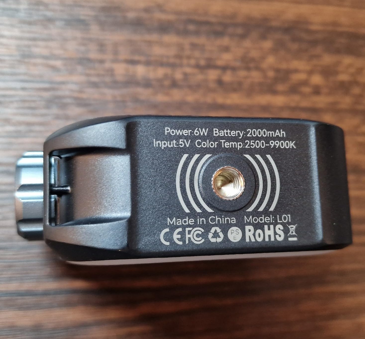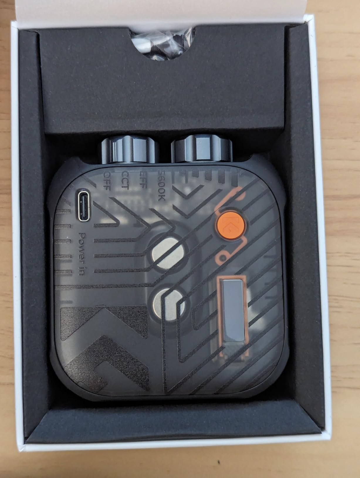 This video light weighs just 123g and has a power cell, rechargeable via a USB-C socket. The light comes with a lead to recharge, a wrist strap and a mount converter allowing it to be clipped onto a cameras hot shoe. The light has a camera screw thread mounting point (for attaching to a tripod) on the top and bottom sides, a magnetic back, a small display and control button/knobs.