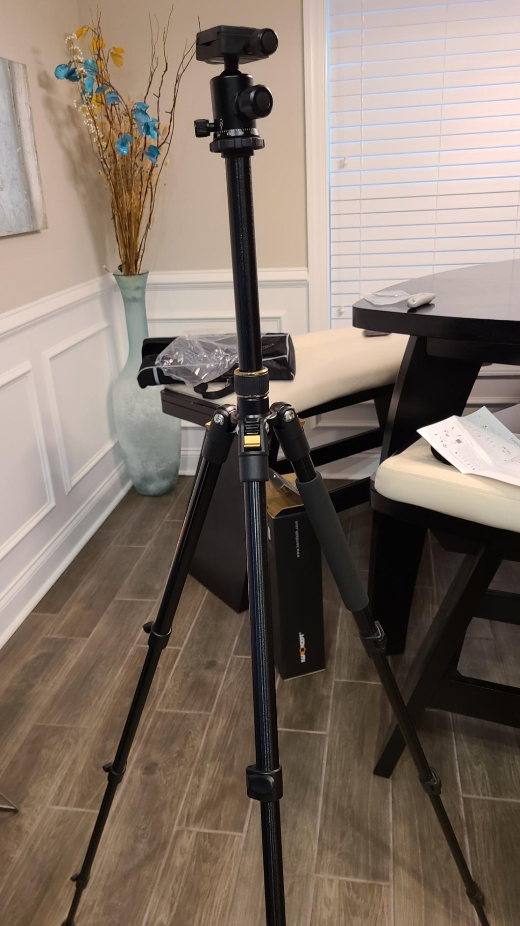 This is a great tripod, whether you're a seasoned professional or some one like myself, who is still learning the ropes of photography. I was using a cheap tripod I had bought for a few bucks at a yard sale but it was wobbly, had zero features and broke on me one day under light use. After doing a little research, and from a few recommendations I decided to go with this one and couldn't be happier.First off it come with a nice carrying case, which includes a shoulder strap so that alone was a plus to me as I often hike with my camera setup. It's fairly compact once folded up so it doesn't take as much room as most. It's super sturdy not only at its shortest height, but also fully extended. The legs feature a quick lock mechanism to ensure no slipping of adjustment once you've got it in place. The head has a quick release, built in level and is set upon a ball type swivel mount. If you need more stability in high winds or what have you, the center column has a hook assemble allowing you to hang a weight of sorts to keep the tripod planted to the ground. It's constructed of aluminum alloy, so it's lightweight and not going to strain your back after lugging it around for hours.