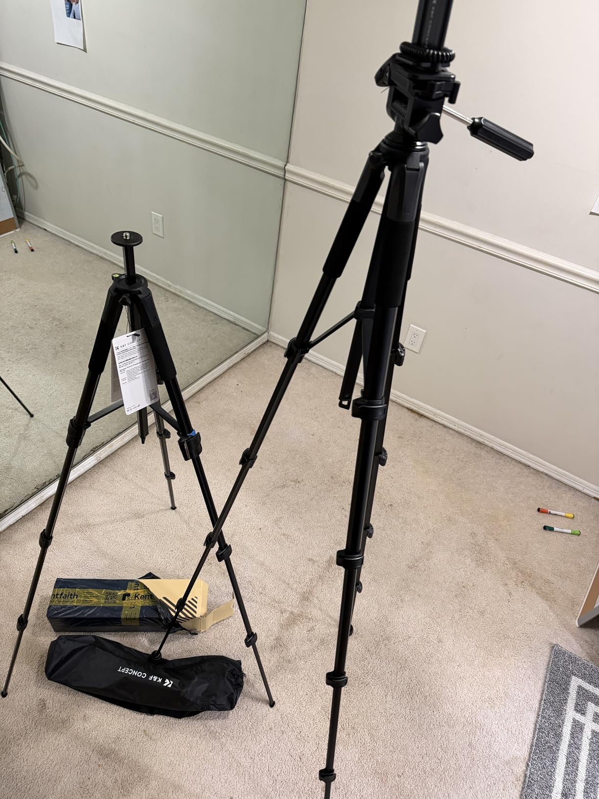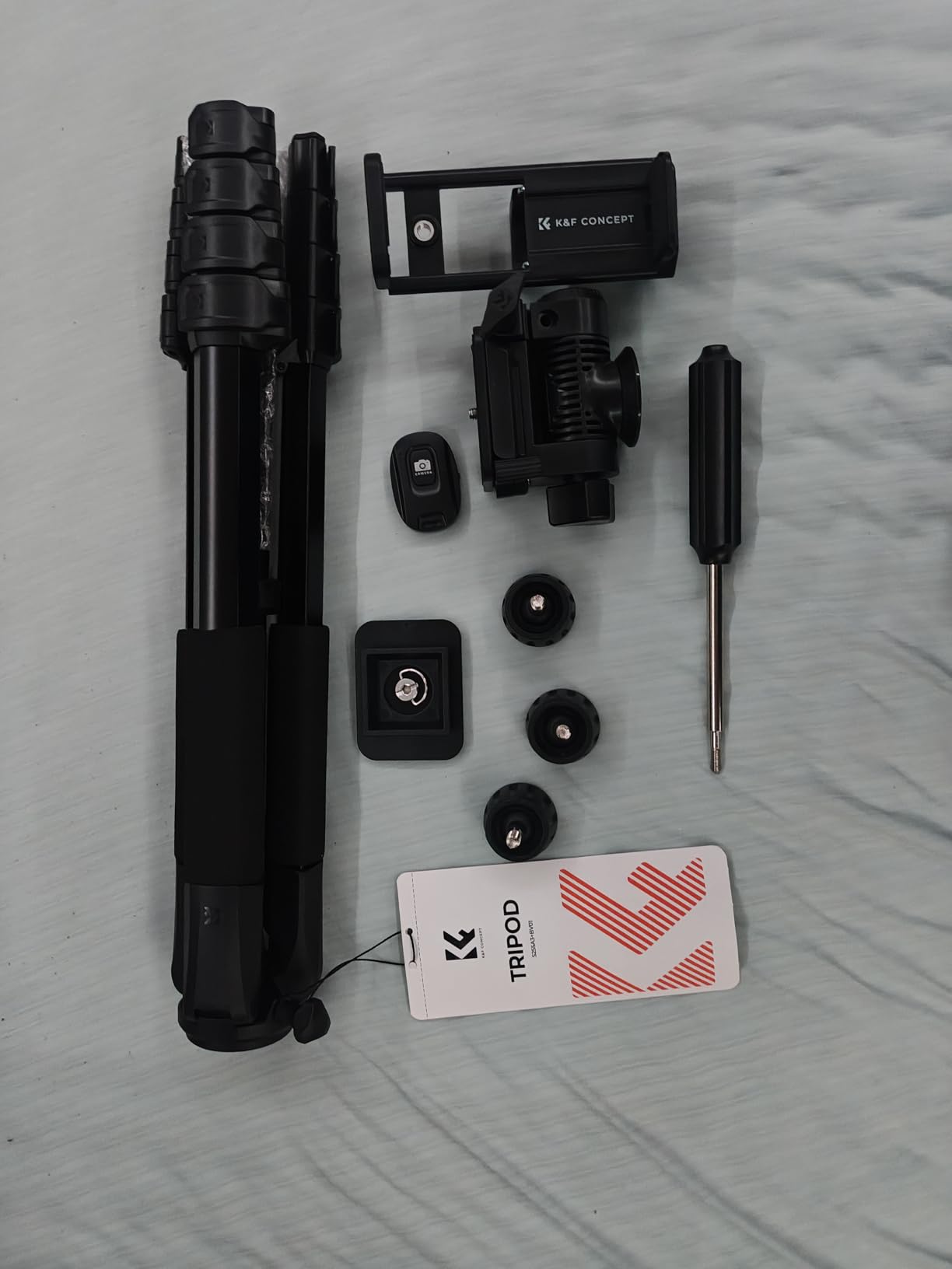 I have several tripods but this one surprised me when I pulled everything out of the zipper bag that I forgot to put the nice bag in the pictures too. The first picture the tripod, instructions, a 360 degree head, with two adapters for cameras, a phone holder that does landscapes & portrait, three feet for the tripod legs, a remote that I bluetoothed to my phone by turning on the remote and just turning on my phone, and searching for a bluetooth connection that is "AB Shutter3" then added to my phone . I would have paid for the remote shutter button all by it's self, for everything they gave me. Second pic I added the head to the tripod and the arm on the head. In the third pic I added the feet to the legs of the tripod. In the 4th pic I added a quick release adapter and the phone adapter to the quick release on the tripod and phone on that adapter is not included, but I put the phone on to show one way the phone can be mounted and in the 5 pic I show the other direction the phone can be mounted on that phone adapter. It is lighter than any other full size tripods I have except the mini ones. I have been thinking I need to buy another one, before they are all gone. It is sturdy, well thought out when they designed it. OK I hope that helps your quest on tripods.