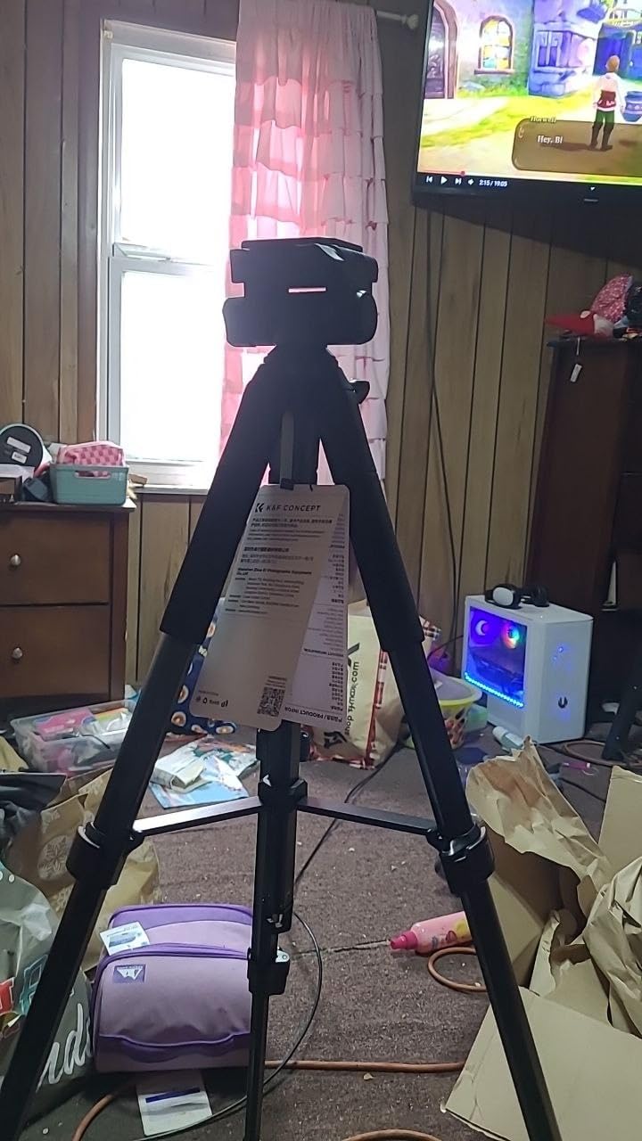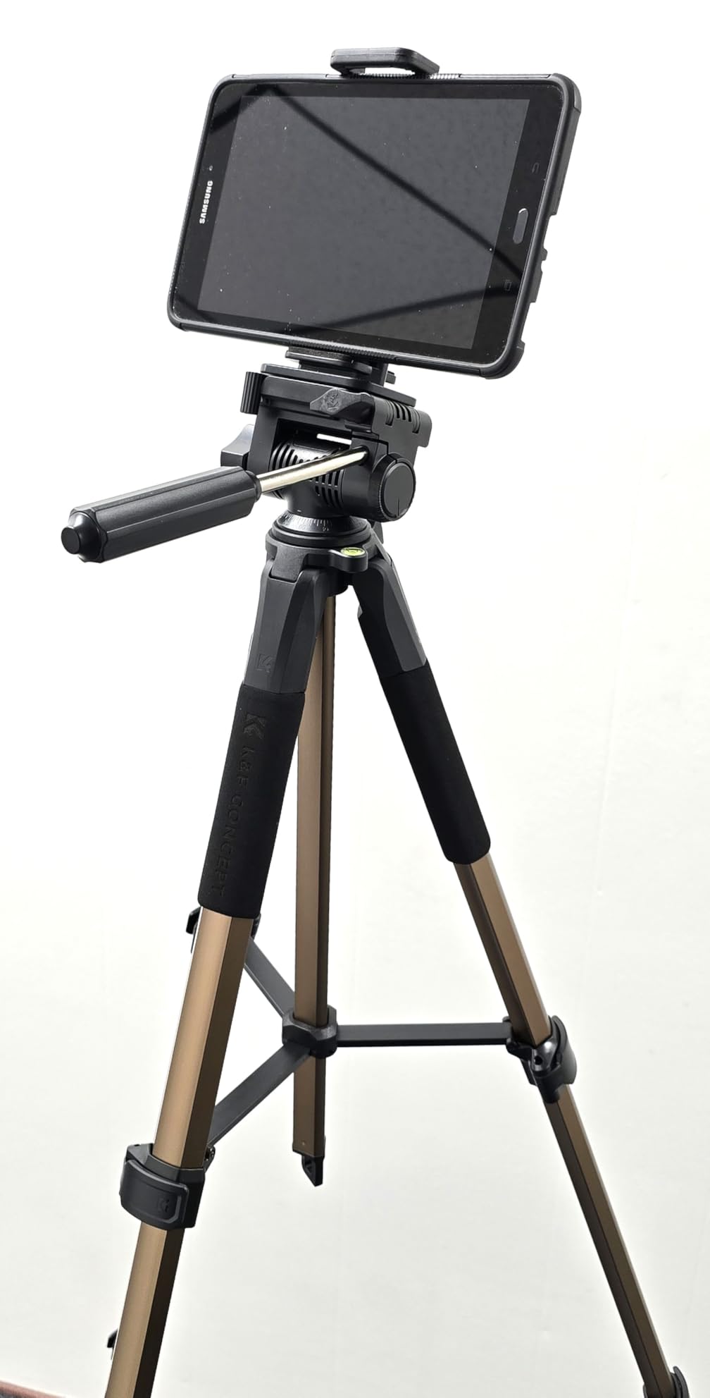 This telescopic tripod works well for holding a phone or tablet in any position you need it. The tripod comes with 3 feet, a swivel mount, phone/tablet mount, a remote control, a zippered bag, and instructions. The feet are allowed to swivel and adapt to any surface and are easy to install in the telescopic tripod legs. The swivel mount works well to hold a variety of devices in any orientation necessary while allowing the user to adjust the orientation as needed. The phone/tablet mount is spring-loaded and seems to firmly grasp phones or tablets of varying sizes. The remote control seems to work well and makes quick and easy work of self-portraits and the zippered bag makes transporting the tripod and attachments a breeze. The clamps on the telescopic legs seem to work well and securely hold the legs in place. The tripod features plenty of adjustments, making it ideal for many different situations. Overall, this tripod works well for occasional creators or for those who need a sturdy tripod for daily use. I especially appreciate how tall this tripod can hold a phone or tablet. This allows even the tallest individuals to easily use a camera, phone, or tablet without having to bend over.