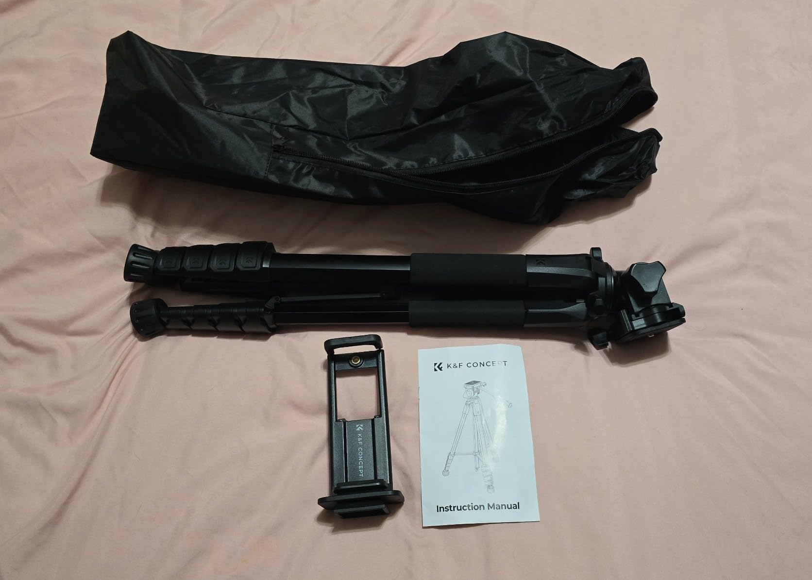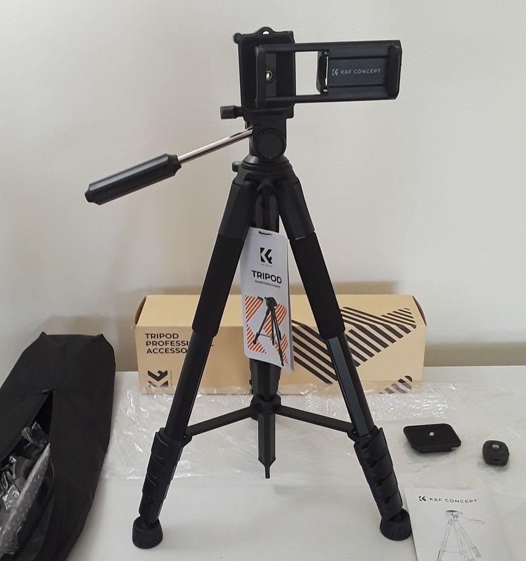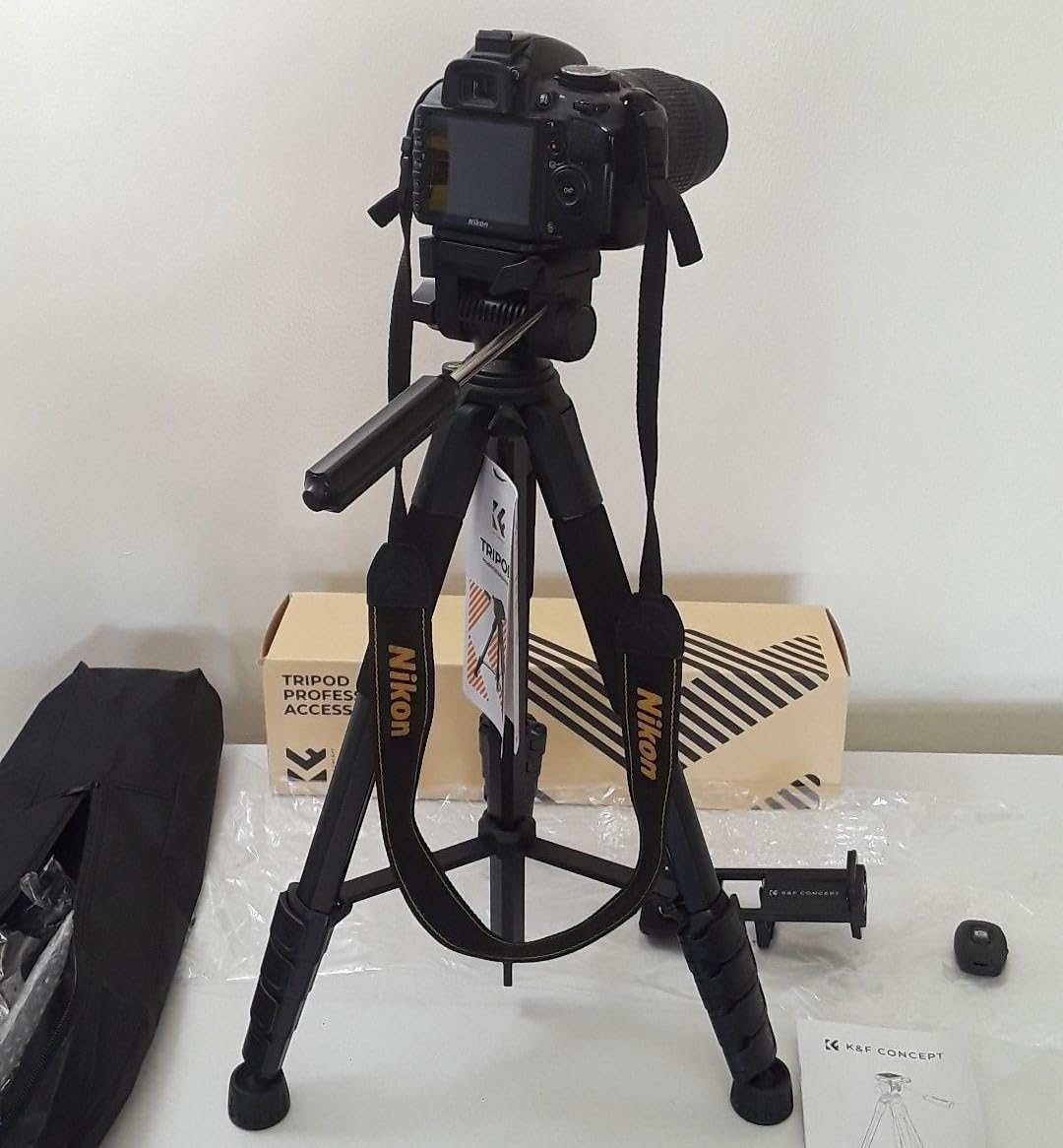 Haven't used this camera holding tripod to it's full capacity, nonetheless, I view it as an excellent addition to the team if your are innthe game of creating contentnor just love to capture memories and live events. Strongly recommend for most cameras with a screw in hole to hold the phone if you can't afford a personal videographer or would like some more independence with the way you use your camera. This item also accomodates mobile phone cameras also as it comes with a clamp like device for holding multi size phones firm and secure without you having to worry about your phone's safety. This K&F Concept tripod has 4 legs with the ability to elongate to reach greater heights and are able to decrease in size for accomodation of different placement techniques you would like to experiment with. Aside from adjusting the height of the legs, you may also adjust the height of the holder itself by turning anticlockwise on of the rotating devices as well as performing the raising or shortening of the holder itself. This product comes with a manual to instuct you on how to effectively use the device to the best of your abilities and capabilities. It also comes with a mini camera device to which has a bluetooth connection to the camera on your phone. The device itself is small enough to fit in the palm of most adult hands and can be portable enough to carry along with your other camera belongings such as a USB Type C charger cable. Also, a branded carrier bag is generously provided to package all the constituents of the product to make the transport of the items a seamless experience.