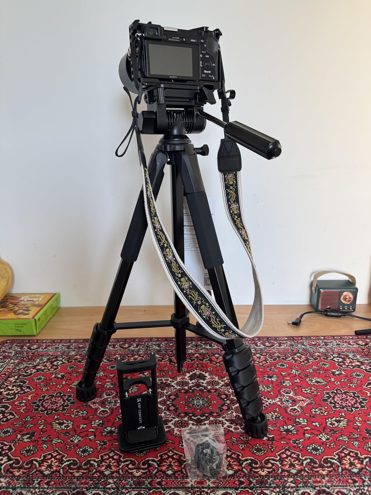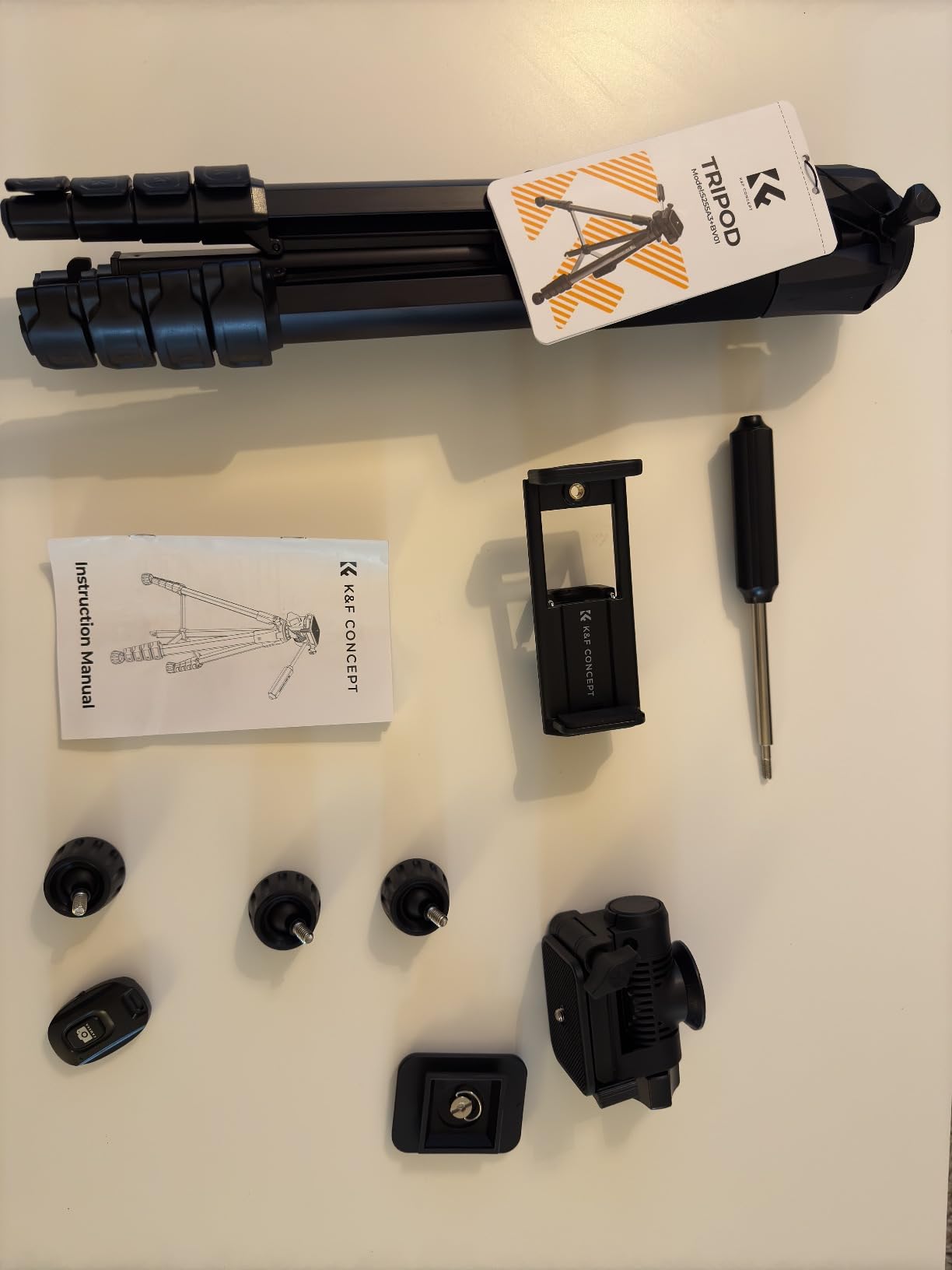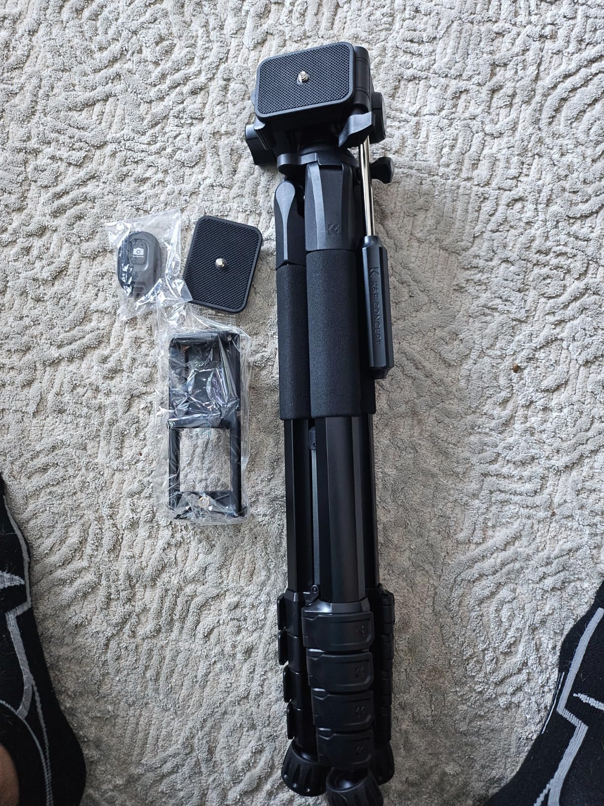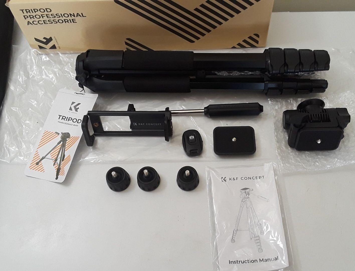 Haven't used this camera holding tripod to it's full capacity, nonetheless, I view it as an excellent addition to the team if your are innthe game of creating contentnor just love to capture memories and live events. Strongly recommend for most cameras with a screw in hole to hold the phone if you can't afford a personal videographer or would like some more independence with the way you use your camera. This item also accomodates mobile phone cameras also as it comes with a clamp like device for holding multi size phones firm and secure without you having to worry about your phone's safety. This K&F Concept tripod has 4 legs with the ability to elongate to reach greater heights and are able to decrease in size for accomodation of different placement techniques you would like to experiment with. Aside from adjusting the height of the legs, you may also adjust the height of the holder itself by turning anticlockwise on of the rotating devices as well as performing the raising or shortening of the holder itself. This product comes with a manual to instuct you on how to effectively use the device to the best of your abilities and capabilities. It also comes with a mini camera device to which has a bluetooth connection to the camera on your phone. The device itself is small enough to fit in the palm of most adult hands and can be portable enough to carry along with your other camera belongings such as a USB Type C charger cable. Also, a branded carrier bag is generously provided to package all the constituents of the product to make the transport of the items a seamless experience.