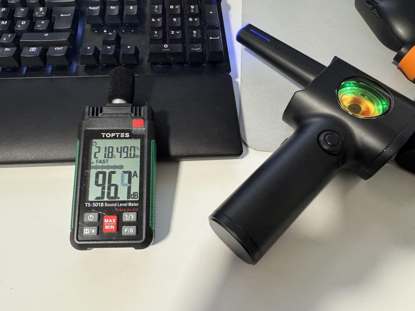 Powerful and compact, I'm very impressed by the size-to-power ratio of this compressed air blower. This blower is just as powerful as my other blower, which is almost twice the size. The blade spins very fast, but it's much quieter than my larger blower. Logically, it should be louder, but the build quality and design make it remarkably quiet.