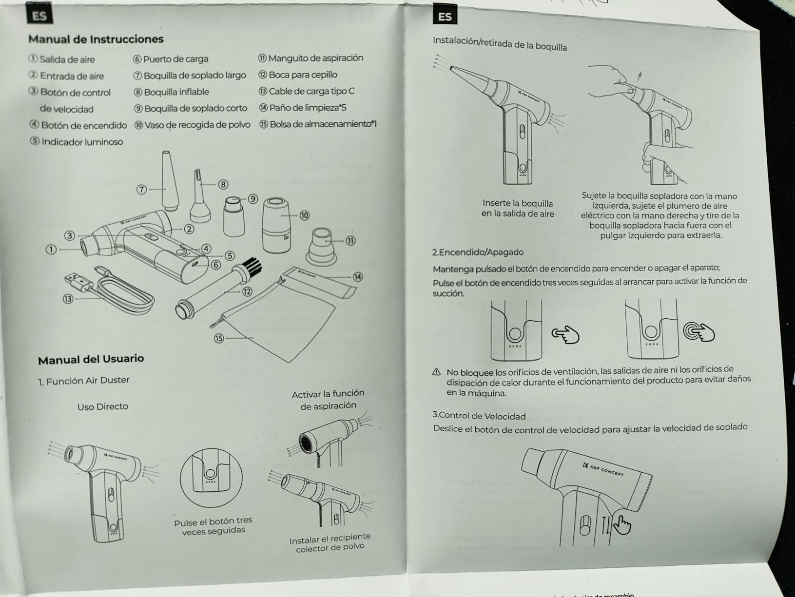 It has a power button that you have to hold down to turn it on and a sliding potentiometer to adjust the blower's power. It comes with various nozzles, filters, cleaning wipes, a manual in Spanish, a USB-C charging cable, and a carrying bag—which is very soft to the touch, by the way.