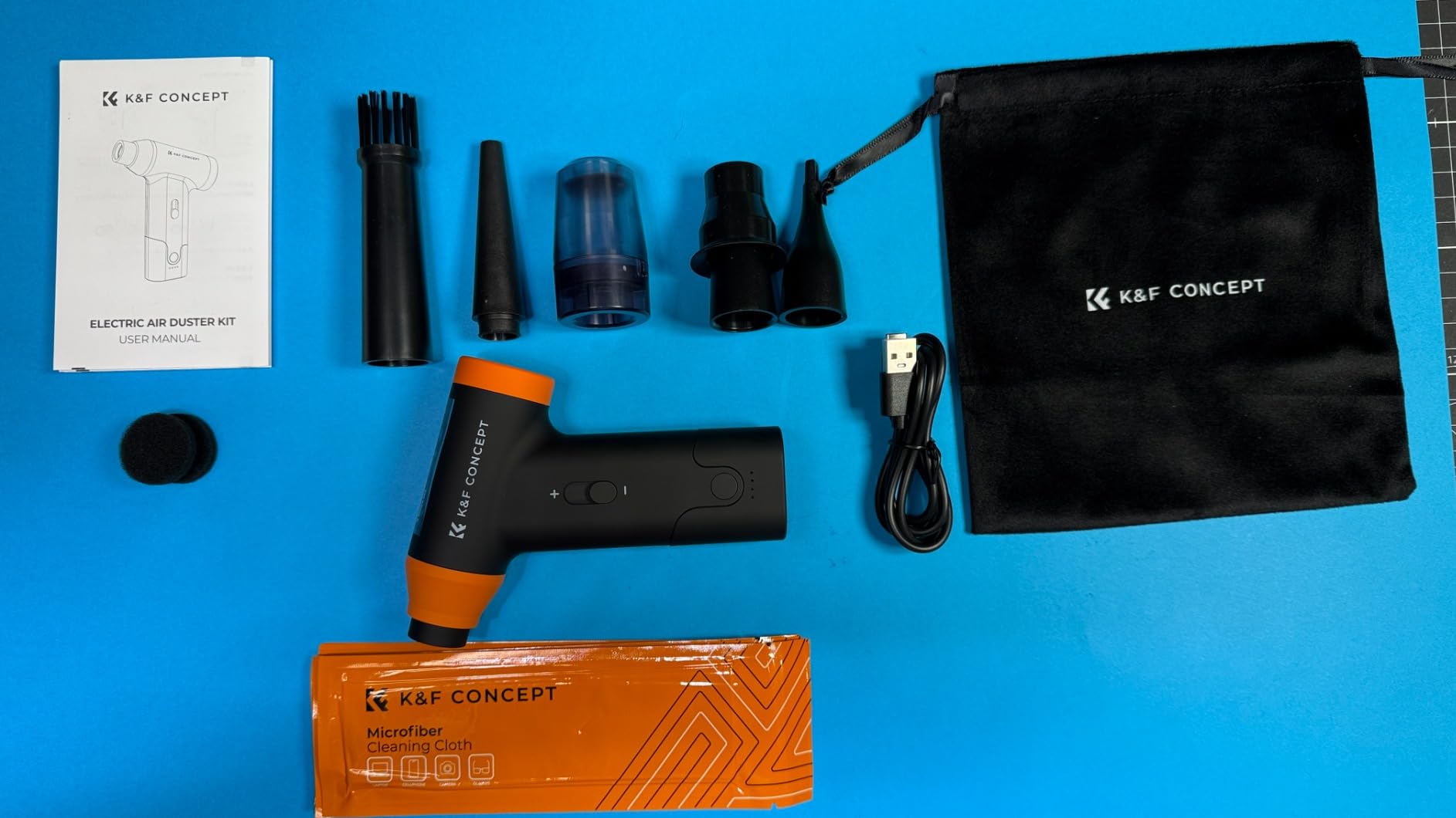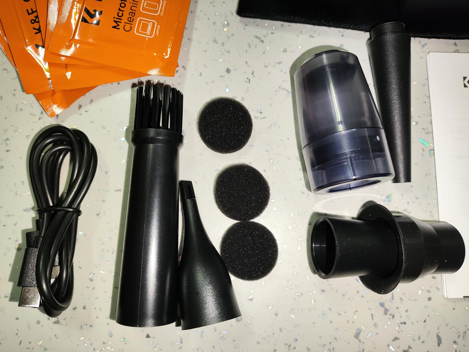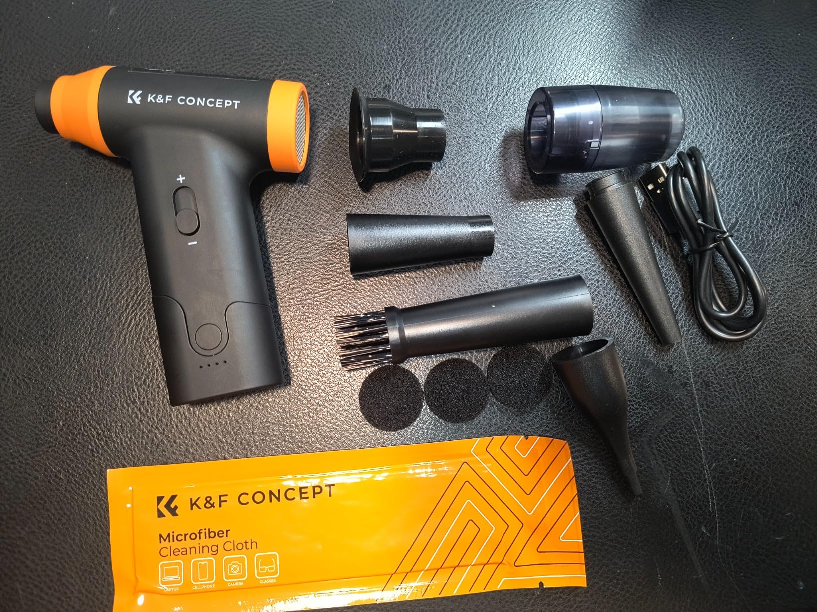 In the box you'll find the blower; multiple accessories with different nozzles depending on your needs, all very easy to attach and detach, so they won't fall off during use; a small cloth bag that fits the accessories and the blower itself perfectly; three foam pads as replacements for the dustbin when you use it as a vacuum; and six orange sachets, each containing a microfiber cloth for cleaning the blower and accessories. I even tried it on my glasses, and it left them remarkably clean.