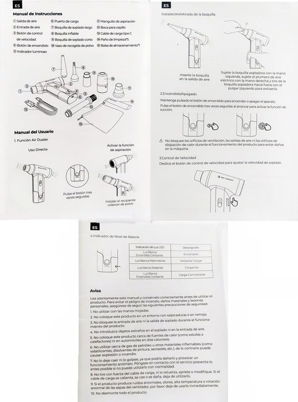 Despite its many advantages, I found a few small flaws that could be improved. For example, the compressed air tank could be slightly larger to avoid having to refill it too frequently during extended cleaning sessions. It would also be helpful to have a battery level indicator so you know exactly when to recharge the device. However, these are minor details that don't significantly compromise the overall quality of the product.