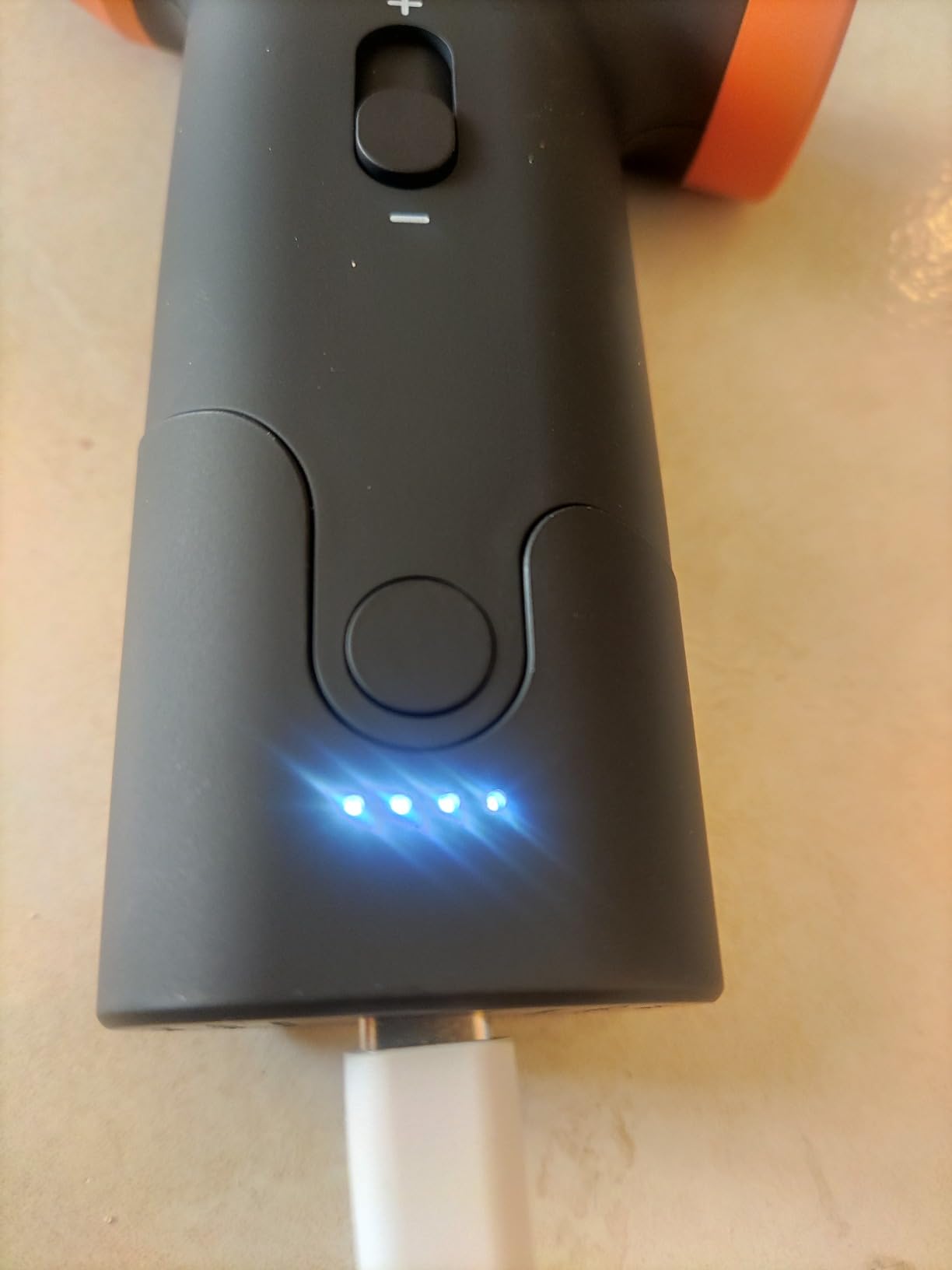 The blower/vacuum has an on/off switch, a slider for power control, a USB-C charging port, and 4 LEDs to indicate the battery level.