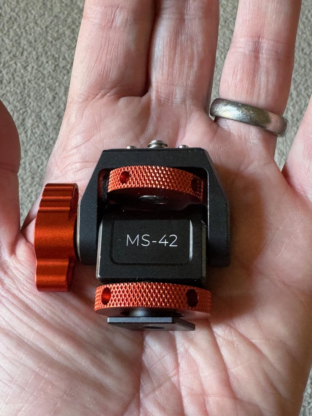 This is a quality external monitor mount by K&F concepts. The build quality, fit and finish are high quality and inspire confidence in use. I have several different types of monitor mounts, and there is definitely a place for cold shoe mount adapters. The top part of the mount has an ARRI ⅜" screw for holding your monitor or light. The bottom attachment point is the cold shoe mount tightened with a large thumbscrew. The amount allows full 180 degree swiveling, and 180 degree tilt. Recommended. Did I mention I love the color scheme?