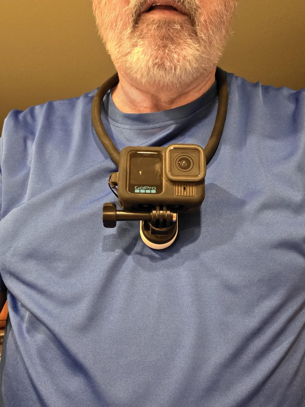 This GoPro neck mount is just the ticket. It loops around your neck and locks nicely into place. The neck band is curiously soft and supple. It bends easily, but doesn't flex when you wouldn't want it to. Mounting gives you plenty of options to rotate the camera and the fact that it detaches is very handy. The magnetic feature is particularly nice because you can feel it snap into place and you know it's secure. The only drawback I see is that it would allow the camera to flop up and down on your chest if you were doing active sports such as dirt biking or skate boarding.