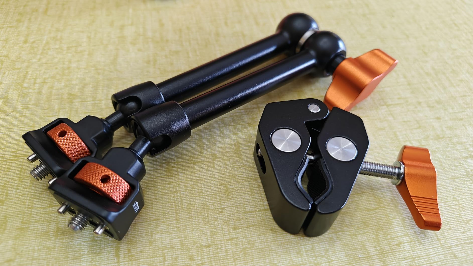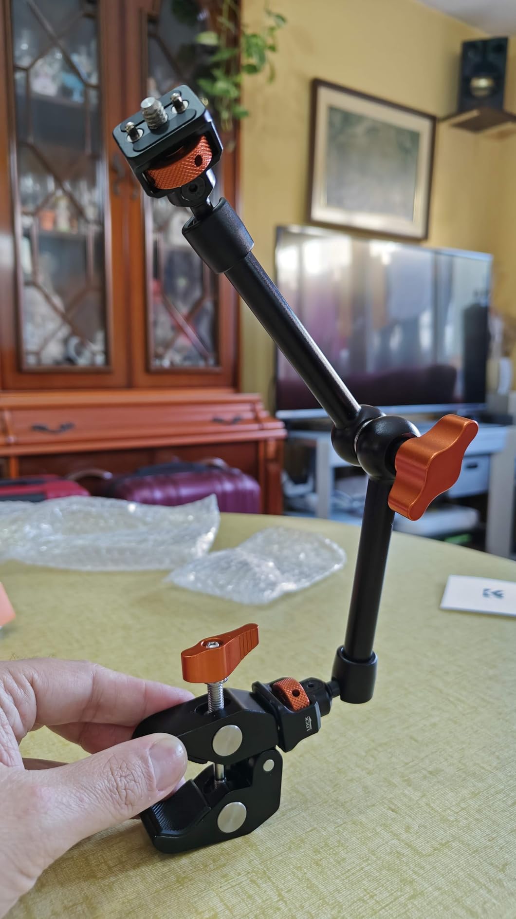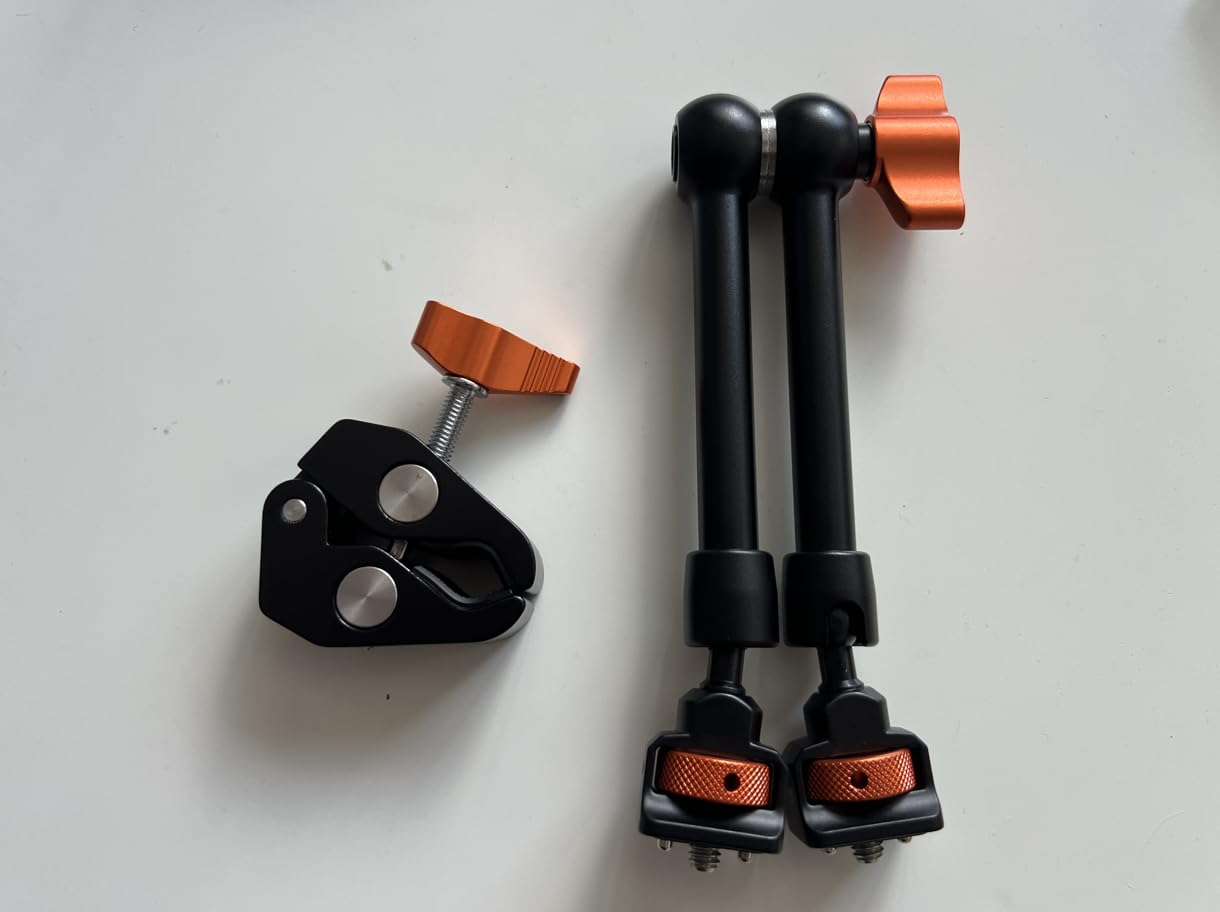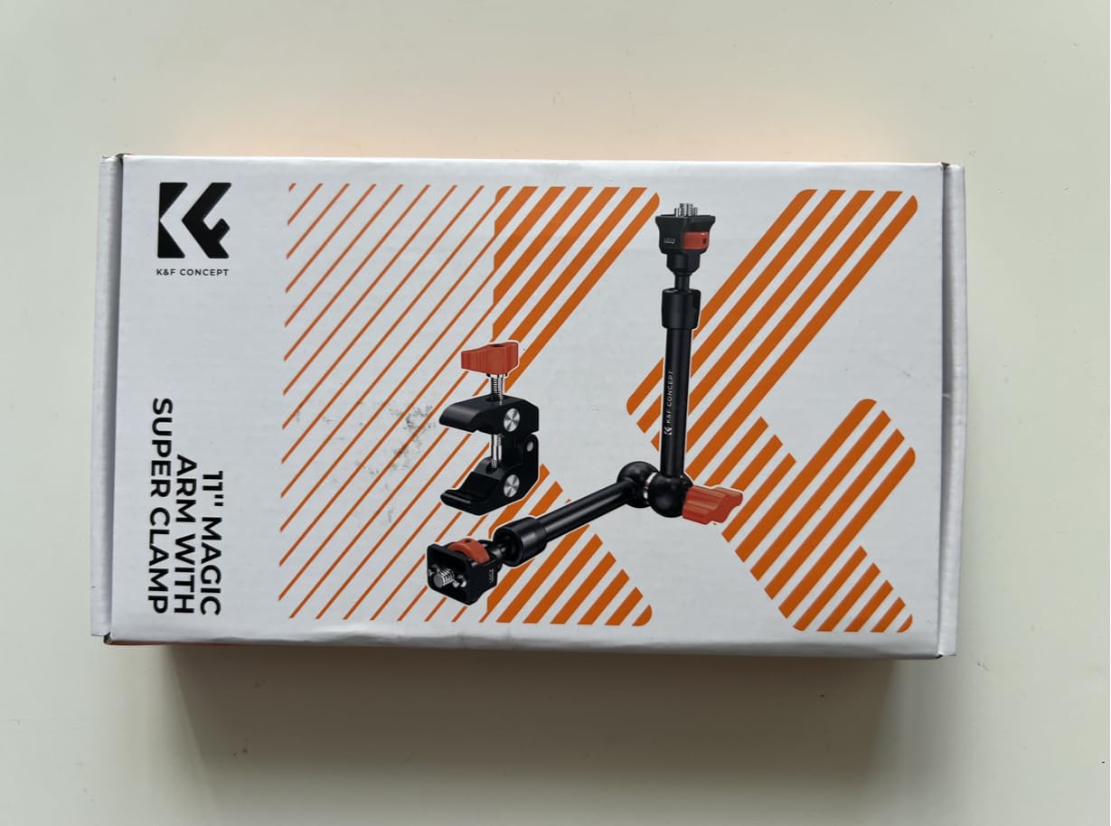 This magic arm clamp from brand K&F CONCEPT is a solid extension to my video rig, in which I have a mirrorless camera setup with a cinema lens and all the bits and pieces for that, but what I was really missing was a way to get my audio a bit more focused from above a subject, and so I installed this arm and a hot shoe boom mic onto the camera cage, rather than on the cameras hot shoe itself.It works just as I had hoped; I noticed that the joints are solid and tightening can be done with a very easy twist. The joints have very little wiggle and so the audio accessories stay in place, which is exactly what I needed.Overall, the 11 inch arm has a fantastic clamp included if you prefer to attach it that way, though it has both 1/4 and 3/8 inch screw mounts, and enough length to serve my purpose. I am happy with it overall. Comes in orange and black, as is the K&F CONCEPT colour tradition. Great brand, always great products. 5 stars.
