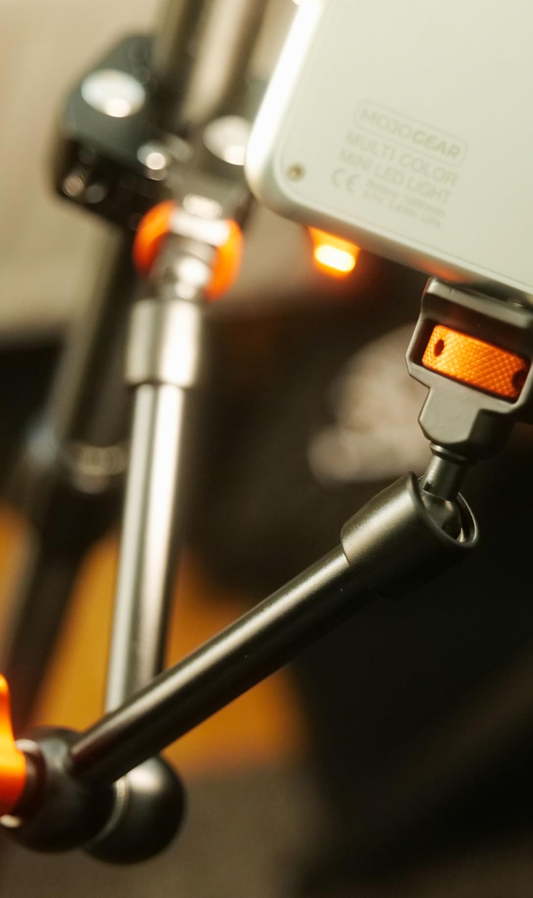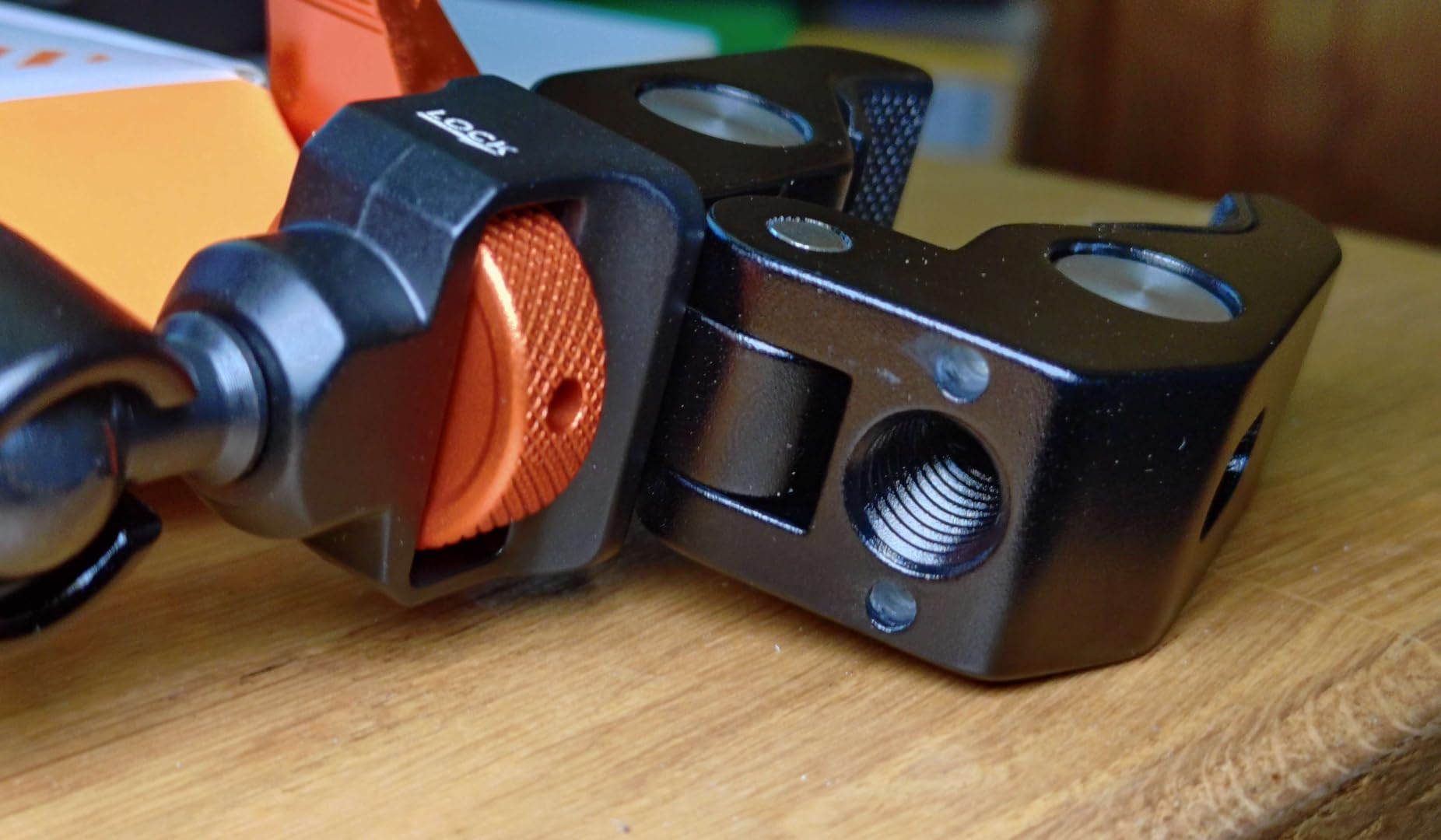 The construction is completely made of metal, qualitatively assembled and feels good in the hands. There is no feeling of a cheap accessory - on the contrary, everything is well done: careful hinges, screws, anodized aluminum, the details look professional. It does not use extra weight, which is especially important when installed on light stands or cameras. The central control handle fixes all the nodes at once - and the ball accessories at the ends, and the central joint. This simplifies setup and saves time: just one adjustment is enough to fix everything in the right position. The reliability of the fastening is excellent - nothing rotates and does not dry out even after several shots in a row.Very flexible in terms of attachment: it can be attached both to the tube and to the edge of the table, handrail, bicycle steering and even the platform. it leaves no trace thanks to the rubber inserts in the clips, and it stays very firm. This makes the accessory universal and suitable for many scenarios, including studio and street shooting.There is no problem with the declared load of up to 2 kg. I have safely attached to it both small lamps and monitors, as well as action cameras. The compact size allows you to take it with you on any trip. When folded, it even fits in the side pocket of the backpack. It is convenient when a lightweight but functional solution is needed to mount the light or camera in unusual places without bulky stands.Aesthetic appearance: black matte metal with bright orange accents makes control more intuitive - orange screws are immediately noticeable and allow you to quickly adjust the desired part even in a hurry. This small detail in practice saves time and reduces the possibility of errors in the frame.