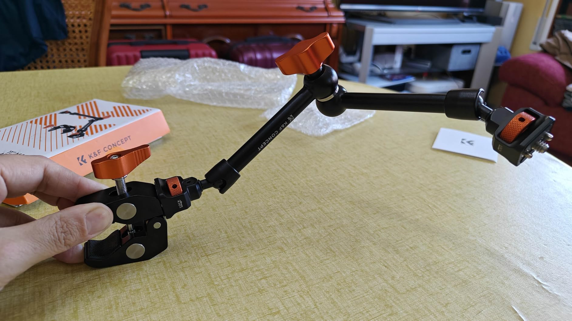 We received a box that is quite compact, it doesn't reach even an inch long. The design is very cool: predominant white background, with the details in that orange so typical of K&F Concept. On the front is a photo of the product that gives you a clear idea of what's inside. When you open the box through the side flap (it is sealed), you find a pair of bubble bags that separate the two pieces of the superclamp, so that we don't get anything scratched or knocked. The first thing that stands out is that it is a product that transmits very good feelings. All absolutely metallic: the sticks, the screw threads, the body of the arm, the handle... you can tell right away that we are dealing with something very sturdy, they have spared nothing. In addition, they have taken good care of the details, everything is perfectly polished, rounded and without any part to scratch. In addition to the matte/satin black finish of the set, we must highlight the pieces that we can squeeze or screw that are in metallic orange. A quick visual aid that contrasts and looks very elegant. The only thing to keep in mind is that, being all metallic, it also weighs its own. It's not an exaggeration, but you can tell the weight in your hand, and even more so if you add accessories. As for its operation, it works great, really. The clamp, which is quite generous in size, comes with a rubber part inside so as not to scratch the surfaces against which we squeeze it, in addition to gaining extra grip. It fits with a metallic popcorn on the top, and you don't have to turn it around a lot to make it firm. The articulated arm is composed of two parts of the same length, which when extended to approximately 25-26 cm. One of the things I liked the most is the ease of use: it has a main popcorn in the center of both parts that, just by squeezing it, automatically fixes both joints at the same time. In addition, that main joint is serrated, which guarantees that once you set the angle, it will not decay for anything in the world. At each end of the arm there is a standard thread pitch adapter, with a ball-type rotating mount, allowing you to attach a lot of accessories such as flashes, continuous lights, microphones, etc... And to be able to place them exactly at the angle you need. And best of all, both ball joints are also fixed by simply squeezing the central popcorn, it's a rod