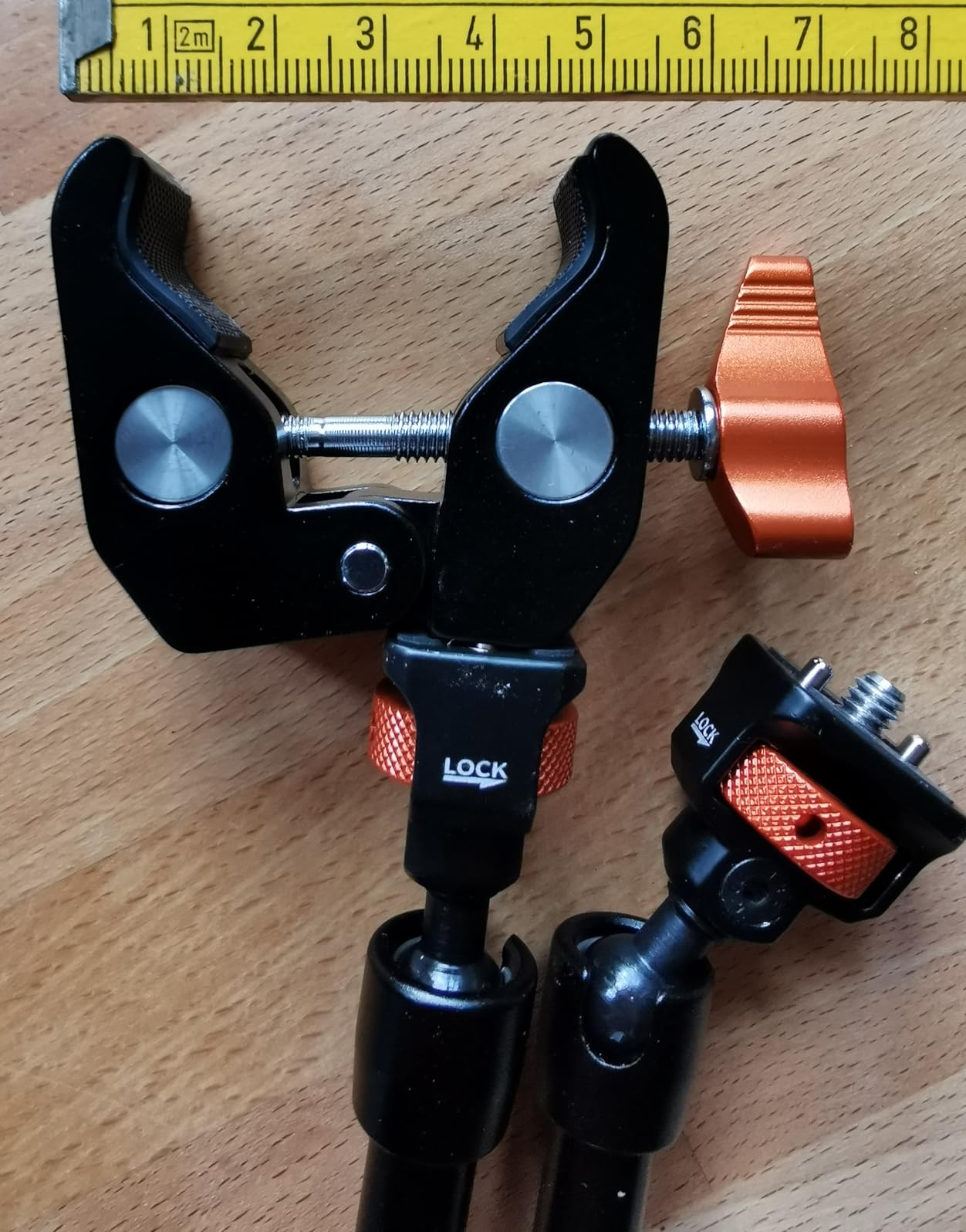 This small magic arm is made entirely of aluminium/metal and is very well made. With just one central locking screw, both the middle joint and the two ball joints are fixed. This allows you to adjust every position quickly. The clamp is covered with plastic pads on the inside to improve the grip on smooth rods. The diameter of the clamp can be adjusted from approx. 1 - 5 cm. Cameras, LEDs, microphones, etc. fit the standard 1/4 inch thread (no DSLR would put on it rather Gopros). The two arms each have a length of 10 cm. A universal accessory for videographers.