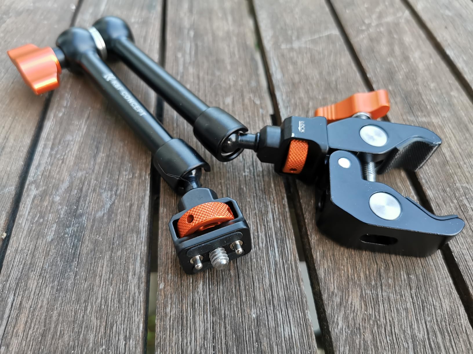 The Magic Arm from K&F Concept is well made and looks chic. The central swivel has good guidance so that the adjustment is easy. This is particularly important because when the central screw is released, all joints are released. If you still have to make sure that the two halves of the central joint lie exactly on top of each other when aligning the equipment, it gets tricky. The arm is sturdy enough for lightweight accessories such as smartphones (with an extra holder), small video lights or monitors. I wouldn't attach a full-frame camera because then, at the latest, the clamp will reach its limits.