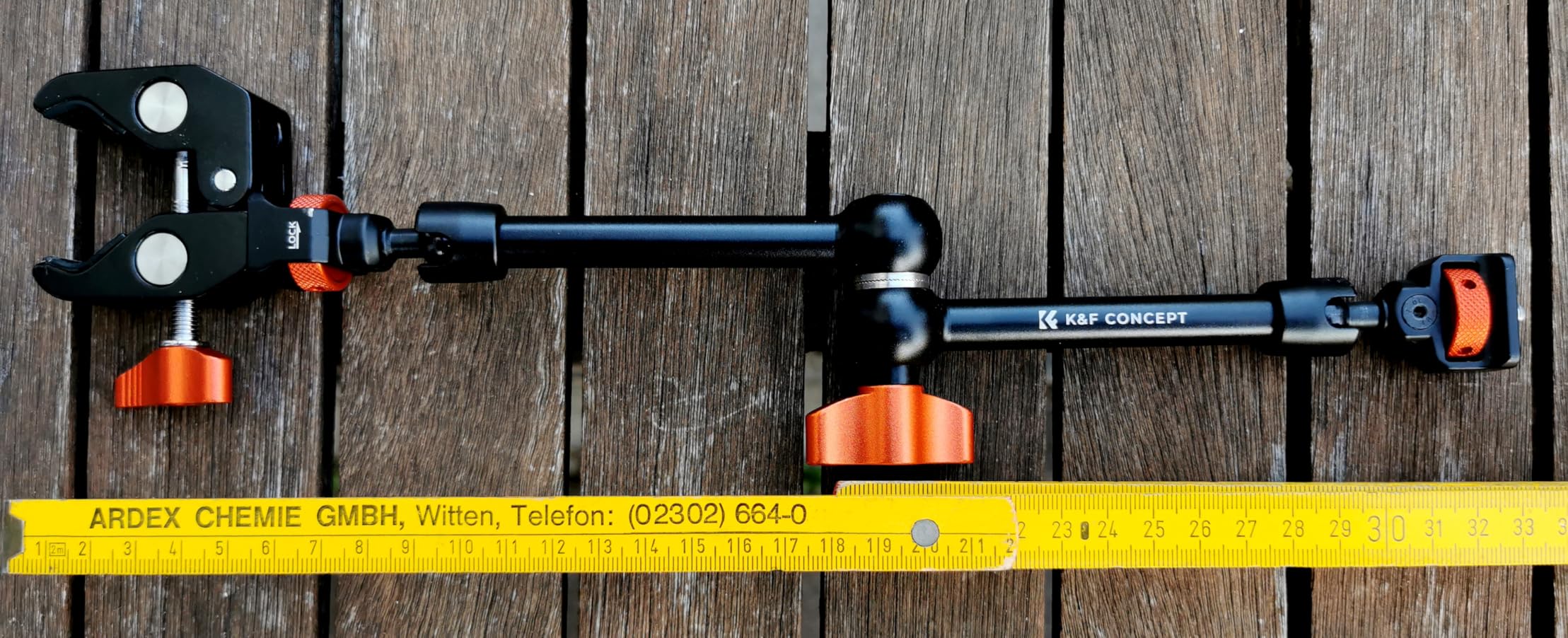 The Magic Arm was delivered in well-protected packaging. Both parts were in the usual K&F Concept quality. I had the extension and the Super Clamp in my hands, neatly finished and in a robust design. The ball joints provide excellent support and can be individually fixed more firmly in case that should things loosen up a bit. To do this, simply tighten the screw connection a bit, but this was not necessary after several uses. The clamp is rubberized on the inside to prevent damage. 2 3/8” and 1/4” threads are integrated to ensure flexibility. The contact surfaces of the Magic Arm are also rubberized on both sides so that the camera, monitor, video light or other accessories remain undamaged. With a maximum load of 2 kg, you are always on the safe side for a wide range of applications. The price/performance ratio is in line with the good quality. Clear and unconditional recommendation, because this Magic Arm is now an integral part of my photo equipment.
