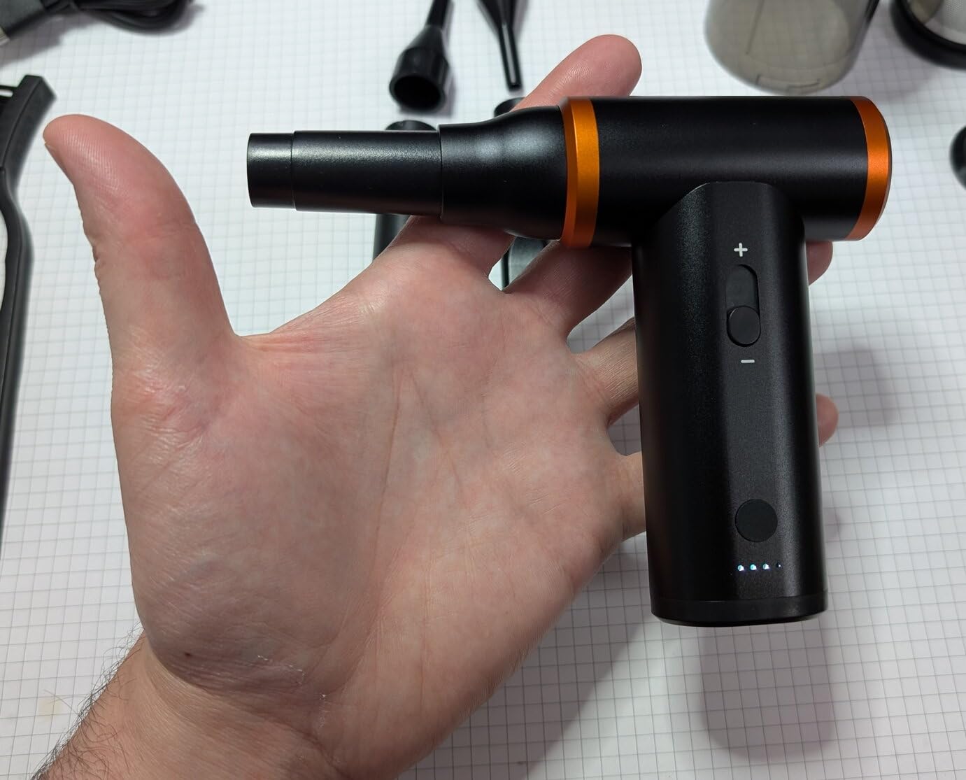 Absolutely brilliant bit of kit! The power on this thing is incredible — easily blasts away dust from keyboards, cameras, and even hard-to-reach PC parts. The adjustable speed settings are really handy, and the build quality feels solid and premium. Battery lasts well between charges too. Way better (and greener) than using disposable air cans. Top marks — highly recommend!