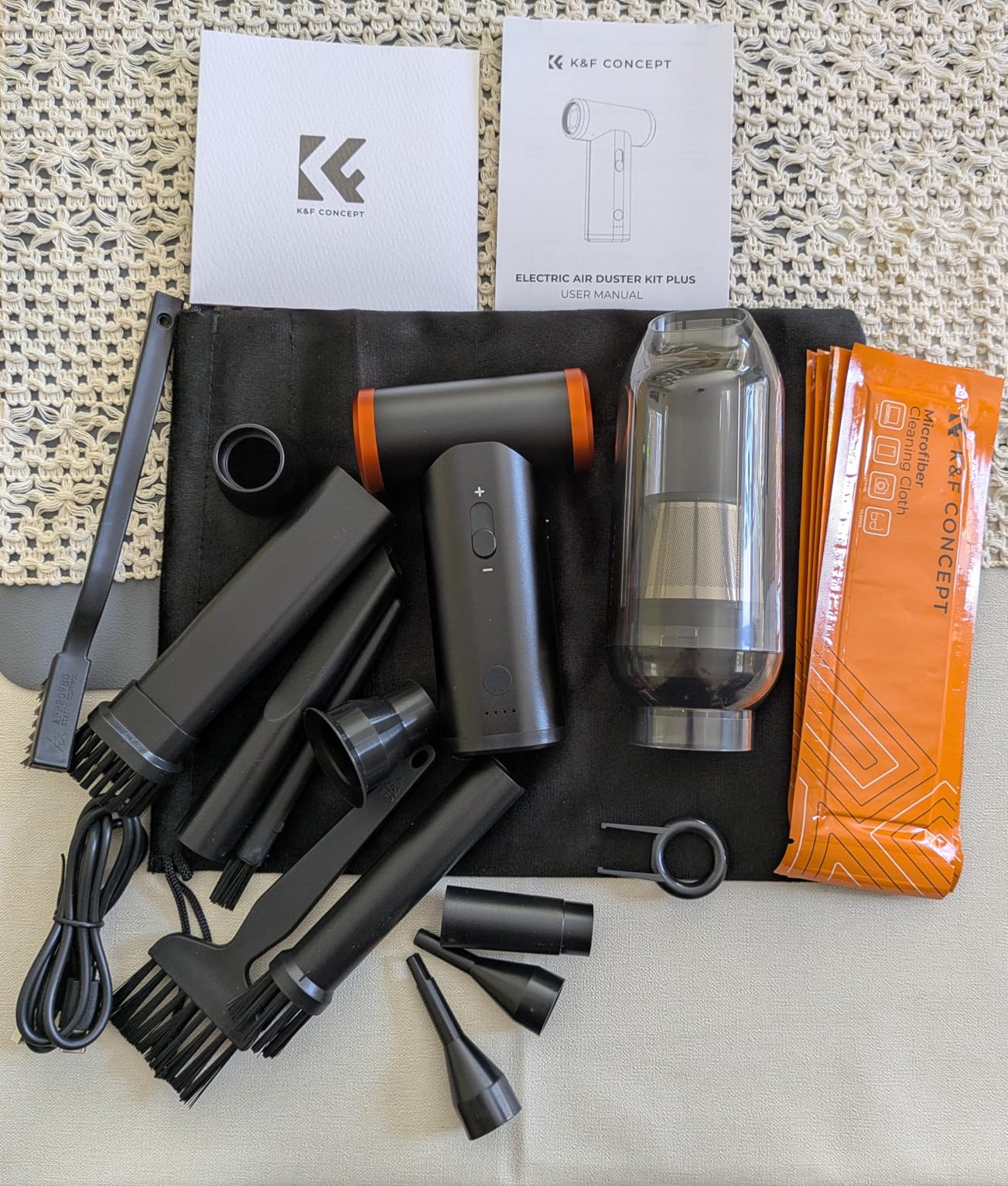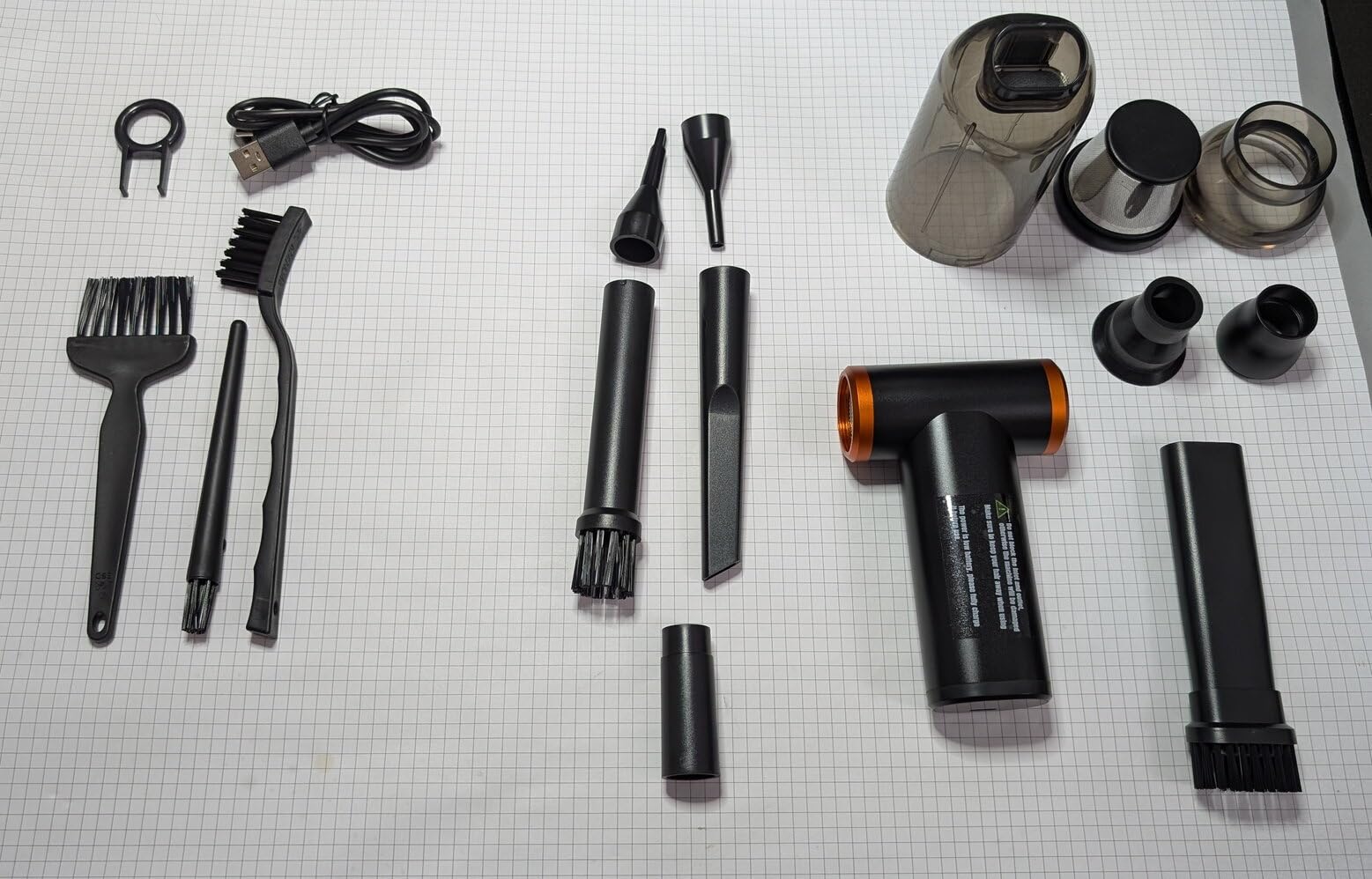 The package includes a blower/vacuum with various attachments and a storage pouch. It also comes with cleaning cloths and a charging cable. The blower/vacuum is powerful and easily removes dust. I like that you can adjust the power with a sliding button. It's very easy to use. The vacuum is quite compact, so it doesn't take up much storage space. The battery life is good, and the noise level is acceptable. I'm satisfied with it; it's a good quality product.